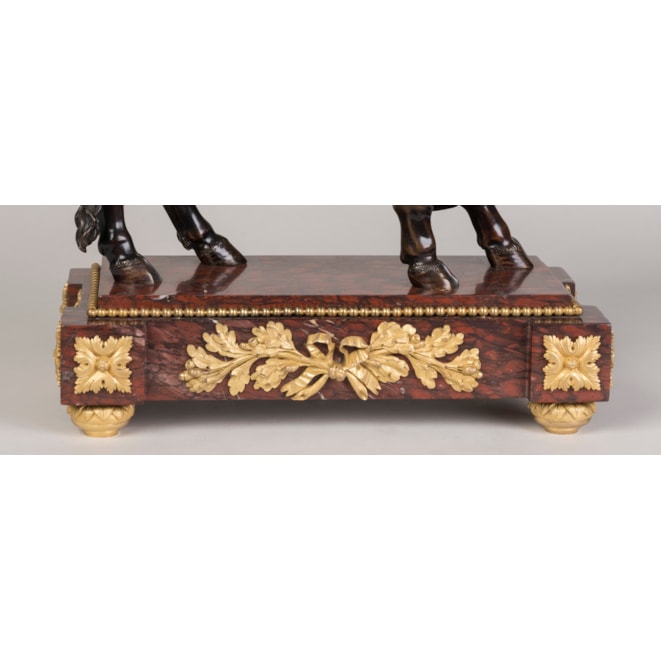 The cast bronze animal with a patinated finish, standing on an ormolu-mounted griotte rouge marble plinth supported on gilt bronze bun feet.