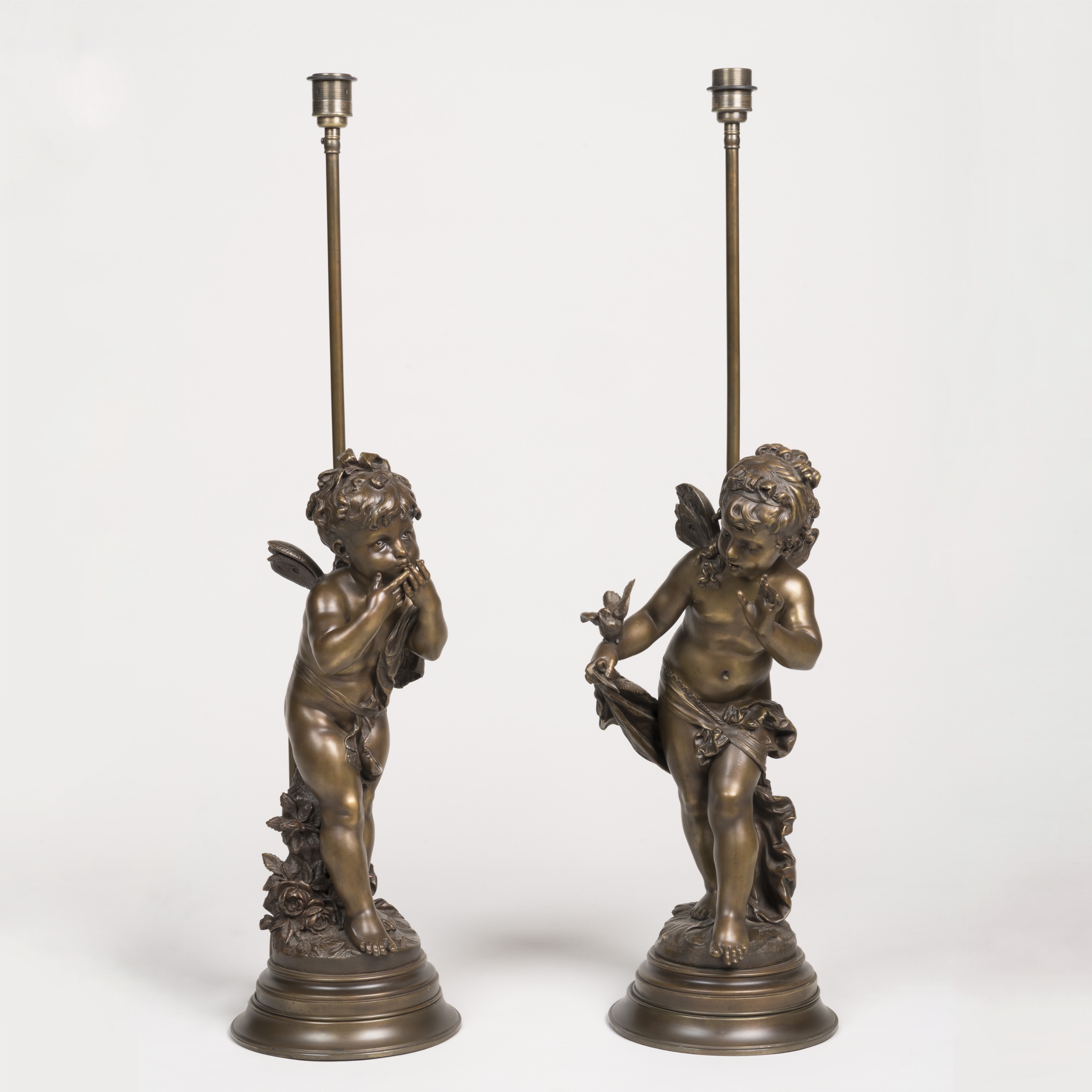 Each figure finely cast from bonze and with its original patination, one representing Moreau's 'Psyche and a Dove,' and the other 'Psyche blowing Kisses.' Converted into lamps with the addition of molded circular plinths, the bases of the bronze signed 'Auguste Moreau.'