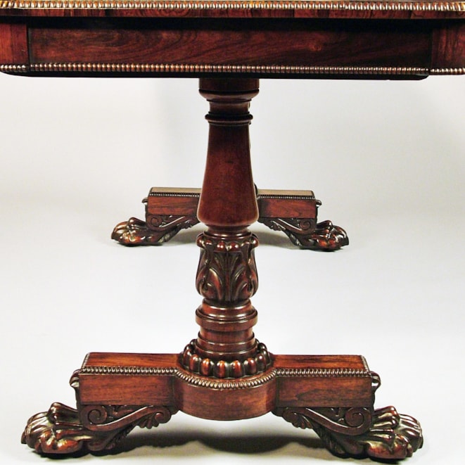 Constructed in goncalo alves, having block end bases on winged feet with castors, the angles having cotton reel turnings, the columns turned, tapered and carved with stiff leaf adornments, with a tapered and ring turned stretcher, the top having radiused corners, with two mahogany lined drawers with quadrant moulding in the frieze, and a conforming ‘cotton reel’ edging. England, Circa 1825.