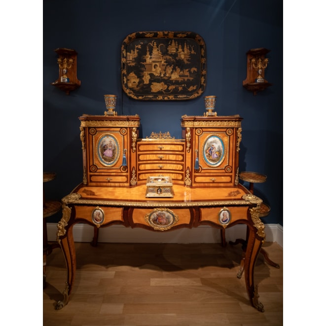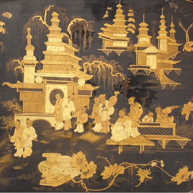 After the invention of the rolling mill, which allowed thin malleable steel with a uniformly flat surface to be produced, and the discovery in Germany of a tin plating process, Thomas Allgood of Pontypool, South Wales utilised the local resources of steel, in conjunction with his discovery of an amalgam that could be fired, and, after firing, giving a jet black field that was capable of being decorated, began the Pontypool, and later, Usk factories. The Chinoiserie fashion espoused by the Prince Regent was used as a basis of decorating a wide range of domestic articles, including tea sets, trays and jardinières, & etc.