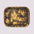 Japanned onto tinplated steel, of dished form, with radiused corners and pierced handles, decorated in gilt with Chinoiserie scenes of court life. Circa 1820, Wales