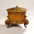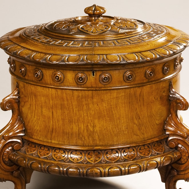 Of cylindrical form, constructed in well figured oak, supported by tripartite feet, of complex winged foot form, with brass castors under: the body with a lobed lower rim, with a running anthemion design over, and surmounted by a pattern of running studded bosses in the upper reserve. The hinged cover with a carved Greek key motif, further further anthemions above, and capped with a lotus bud finial. The interior is now baize lined. The four lever lock indistinctly marked, and having an old storage label below. English, Circa 1850.