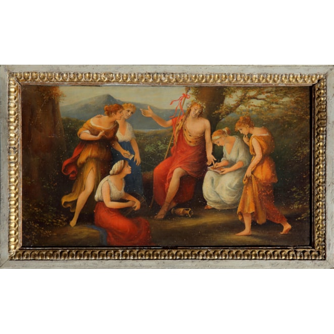 The frame carved part gilded and polychrome decorated, with the inverted breakfront top shelf having a running carved foliate decoration; the frieze having to the centre a rectangular Neo-classical copper panel, painted in the manner of Angelica Kauffman of Apollo and his Muses, and being flanked by further panels of bouquets of ribband tied roses, and, to the extremes, panels of classical females allegories of Comedy and Drama; the vertical uprights painted with panels of climbing flower wreaths. Circa 1880
