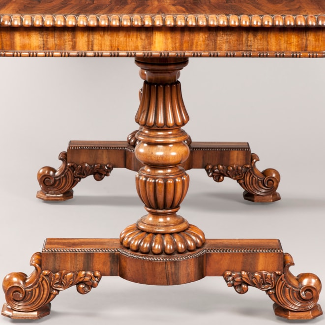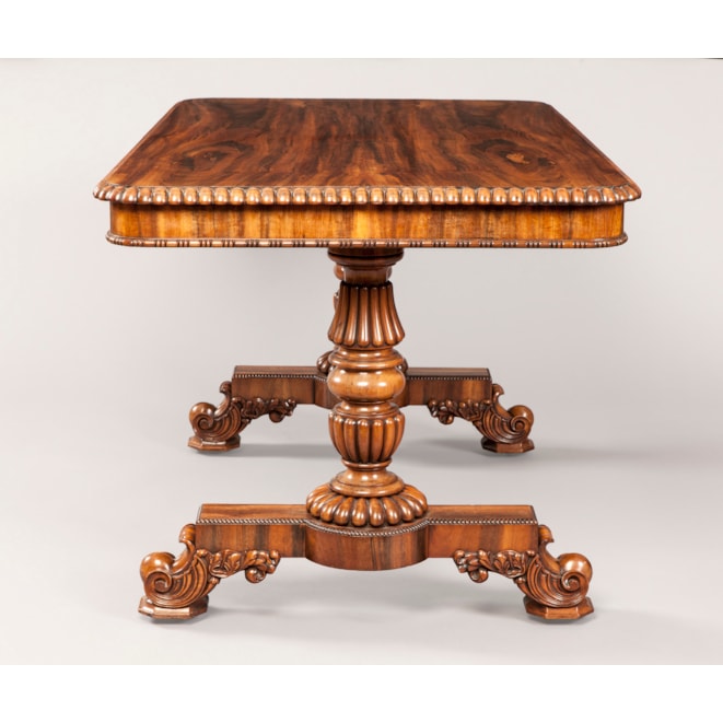 Constructed in goncalo alves, the tapered and fluted baluster ends supported by a block form base with a lobed platform and a running pearl edging, above scrolled feet of foliate design, with sunken brass castors; the top having radiused corners, with a lobed edge, and in the frieze, two mahogany lined drawers with quadrant mouldings, between a bead and reel moulding. Stamped to the top of one drawer, ‘Gillows Lancaster’. This design for a table appears on many occasions between 1822 and 1830 in the Gillows Sketchbooks, held in the City of Westminster archives.
