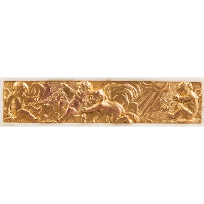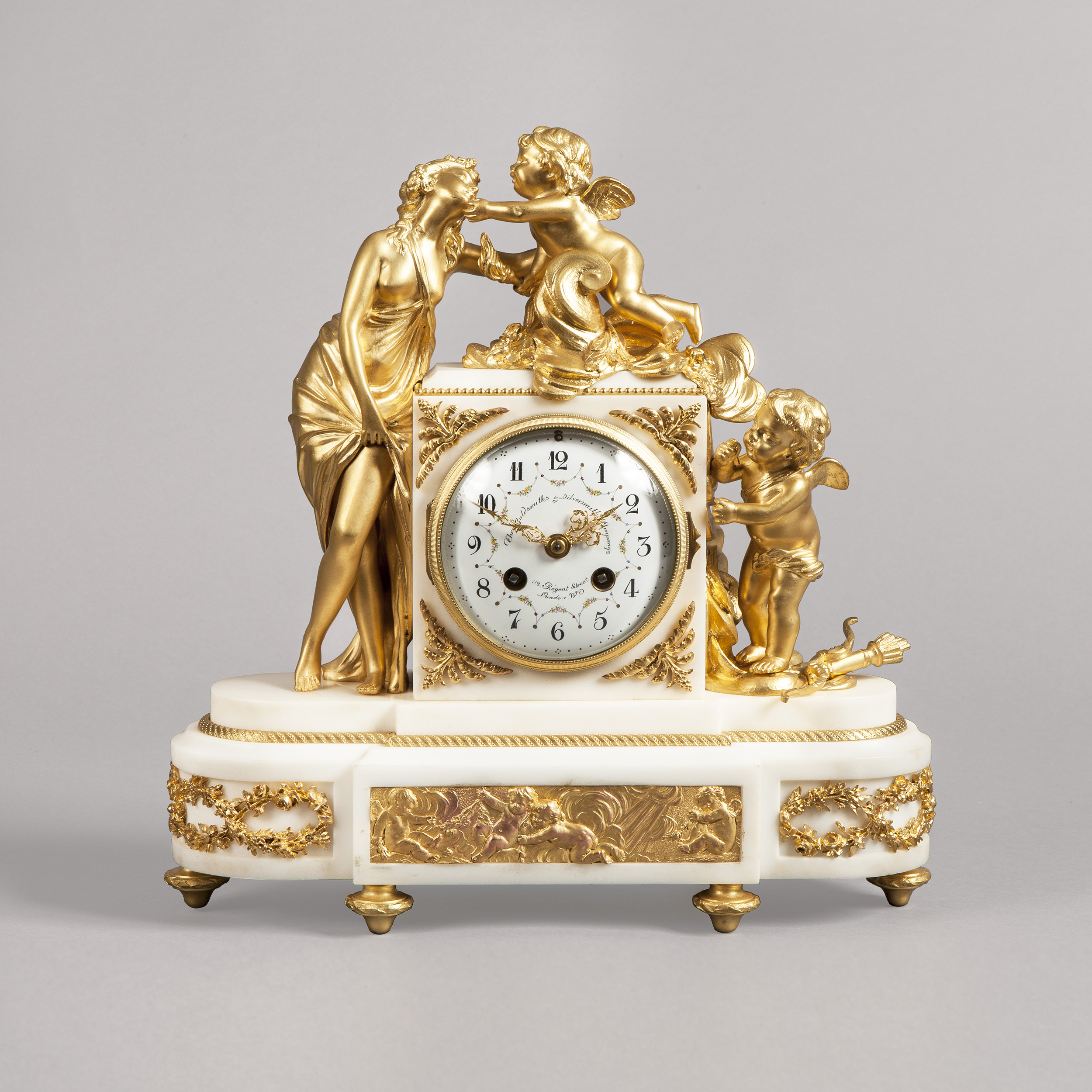 Constructed in Carrara marble adorned with fine ormolu highlights; rising from gilt bronze toupie feet, the marble case having ‘D’ form ends, adorned with foliate entrelacs, with a central ormolu panel depicting disporting putti and over, the circular enamel dial hand painted in polychromes with garlands, and the hours painted in Arabic numerals, signed by the retailers, The Goldsmiths & Silversmiths Company of 112 Regent Street London W., with an eight day movement, the hours striking on a bell, stamped by Vincenti & Cie, and R&C, for Richard and Company, numbered 4369: the case is surmounted by Cupid, his bow and quiver at hand, holding a lighted torch, emblematic of passion, a theme echoed by a scantily clad young beauty in a provocative pose. French, Circa 1890