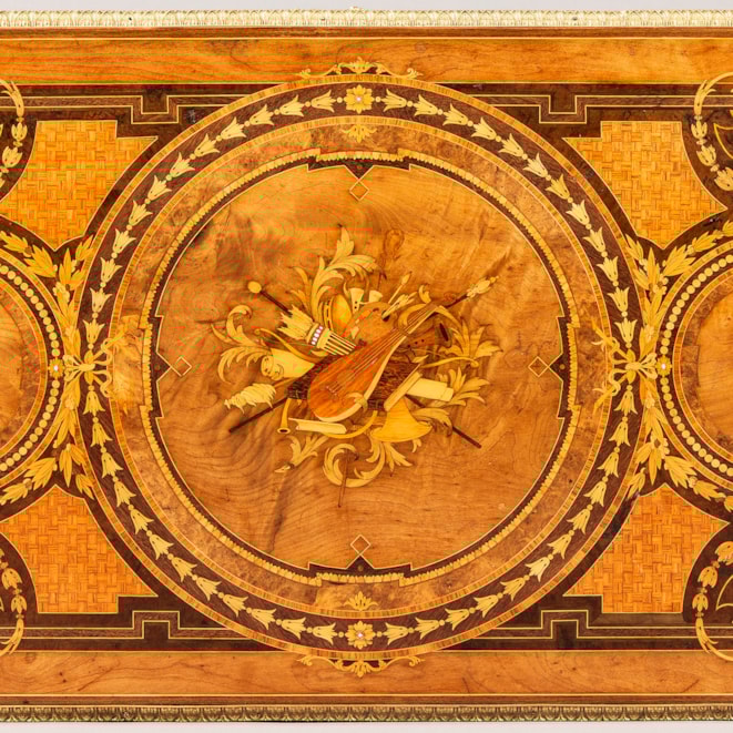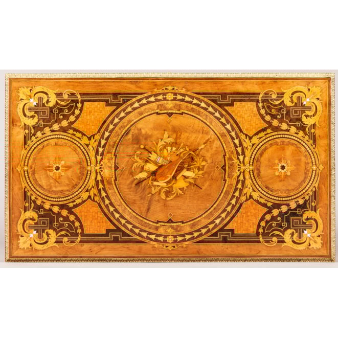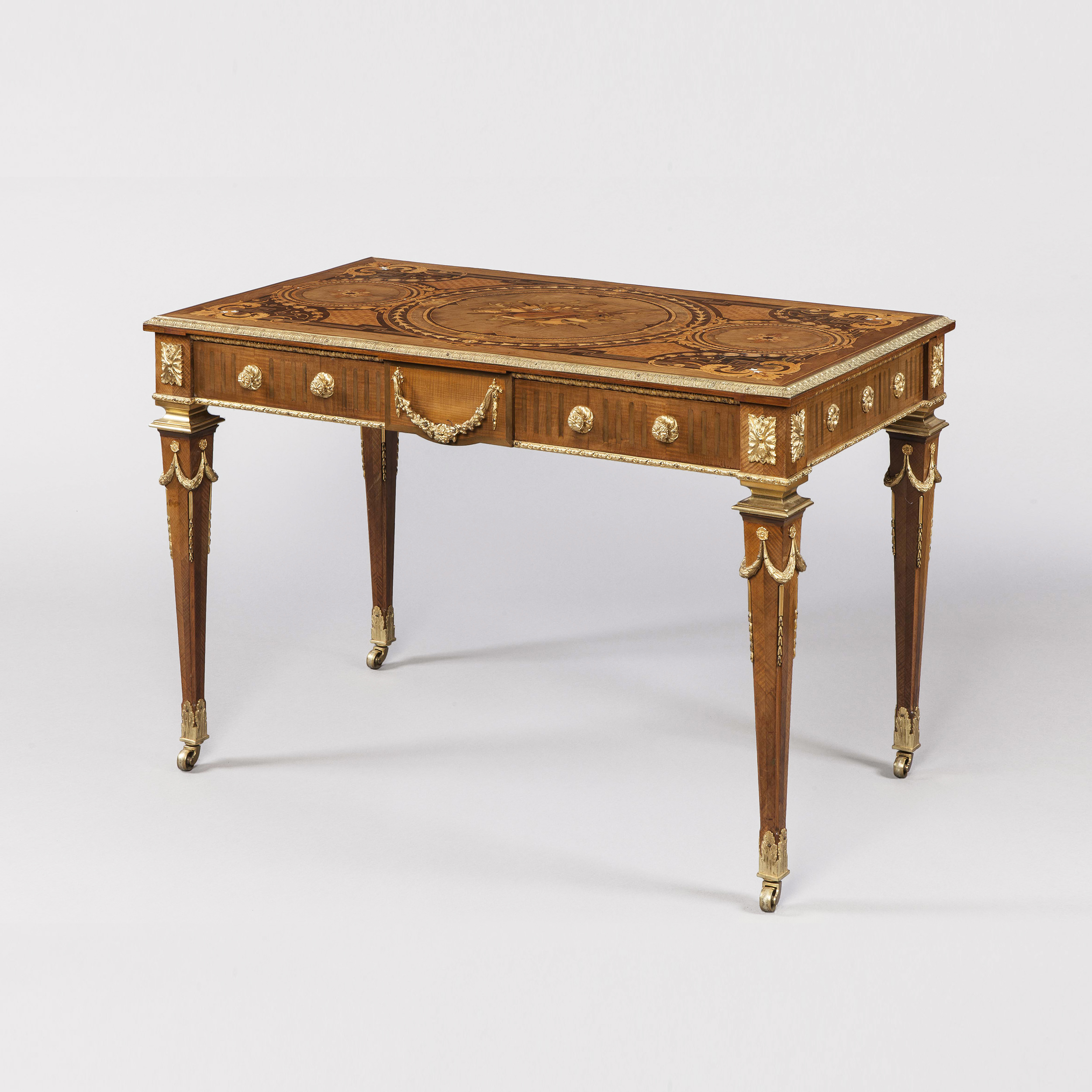 A Magnificent Library Table in the Adam Manner By Howard & Sons Of free standing form, constructed using a field of finely grained sycamore, with precise use of its close relative, harewood in counterpoint, as well as purpleheart in the cross bandings and, inter alia, boxwood, thuya and circassian walnut in the comprehensive and complex marquetry and parquetry work, which is of the very finest craftsmanship, incorporating designs from the oeuvre of Robert Adam, the whole being dressed with fire-gilt ormolu mounts which are crisply cast, chased and gilded: rising from square section collared tapering legs, the ormolu toes incorporating castors; the apron inlaid with a running band comprising vertical fillets of harewood, housing two drawers dressed with pairs of ormolu knobs, which flank a swag adorned central square tablet: the extraordinary platform is framed within a running stiff leaf ormolu framework, an outer geometrical cross banding in purpleheart enclosing a large, and two flanking smaller circles, and at the angles, symmetrically shaped spandrels, all delineated in precise and artistically executed marquetry work, which includes the attributes of music, parquetry, Bellflowers and foliates. Circa 1870