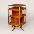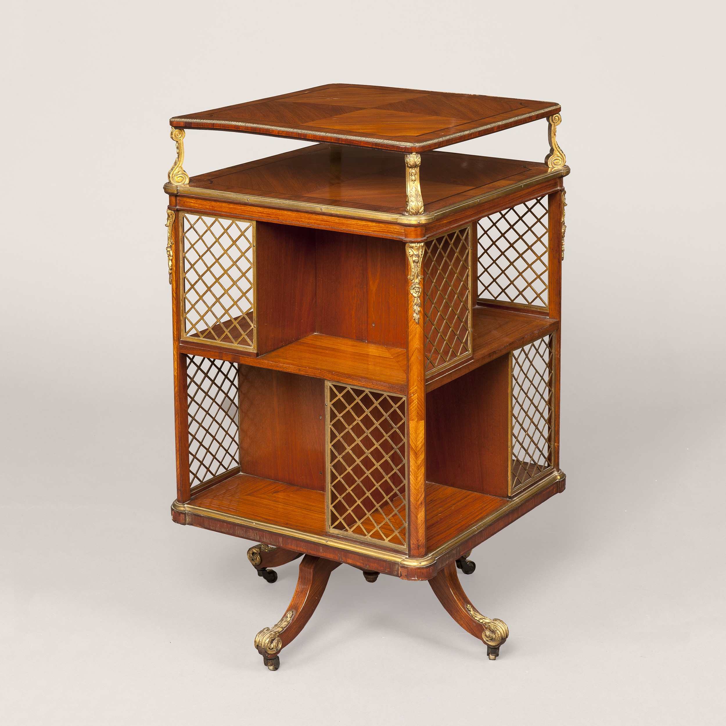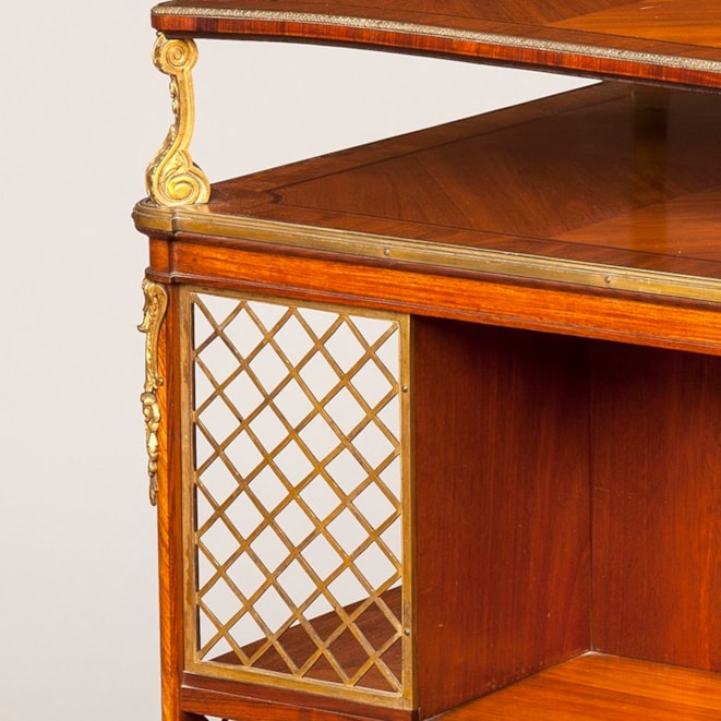 Constructed in kingwood, amaranth and goncalo alves, and dressed with high quality gilt bronze work; rising from quadripartite swept and hipped legs dressed with foliate sabots and castors; the two lower shelves have bronze trellis dividers, and over, swept gilt bronze spandrels support the quarter veneered platform.