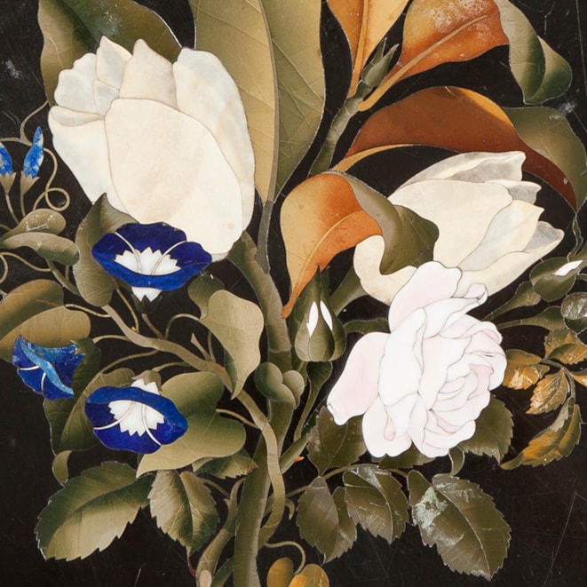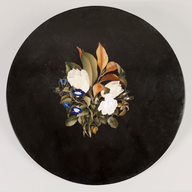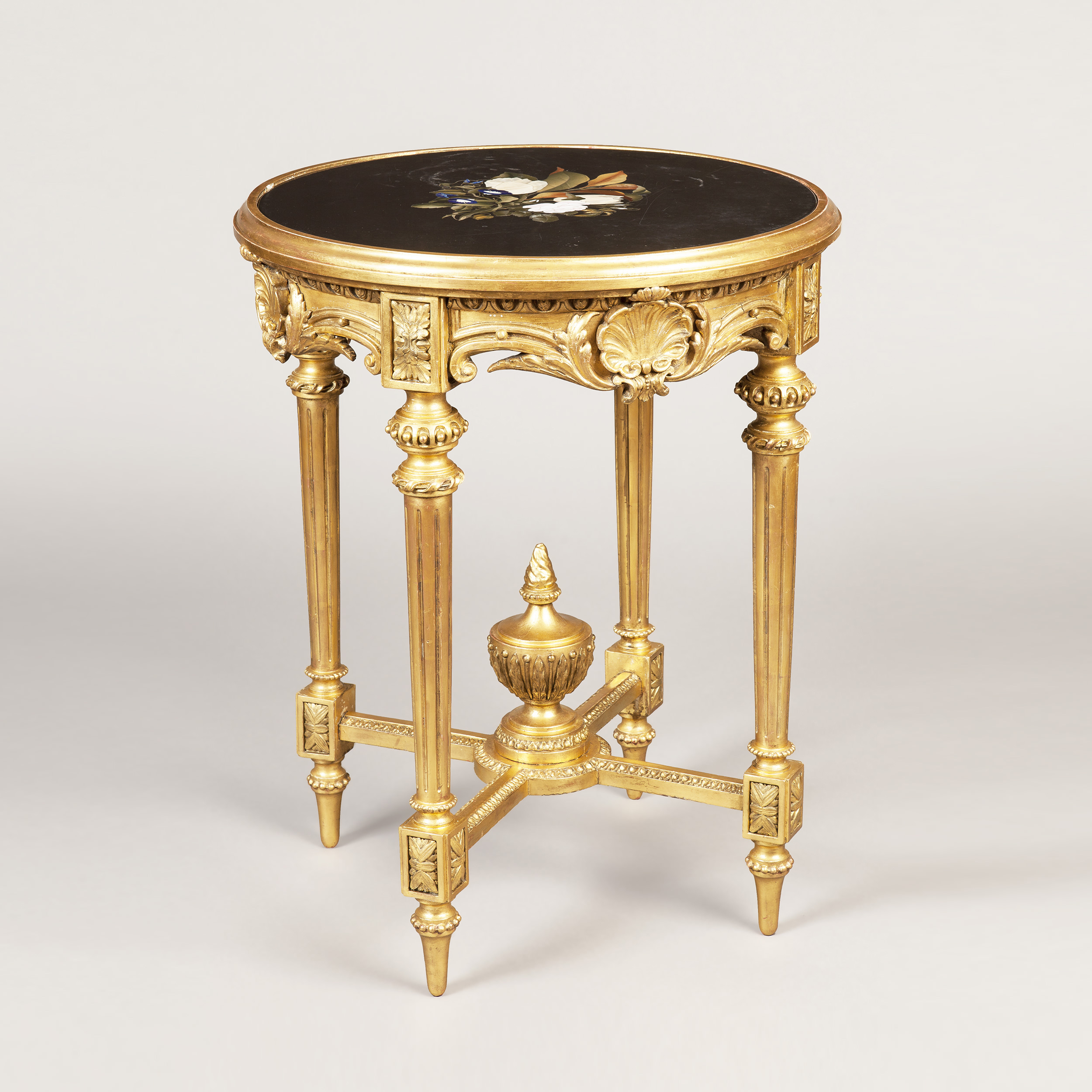 Constructed in giltwood, with a hardstone inlaid top; of circular form, rising from circular toupie feet, the conforming legs conjoined by a carved cross stretcher having a central finial with a flambeau atop; the apron dressed with scallop shells, and a running pearl moulding; the platform having a Derbyshire slate ground inlaid with a bouquet.