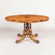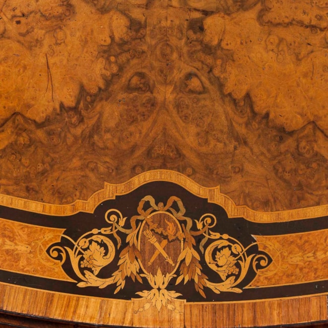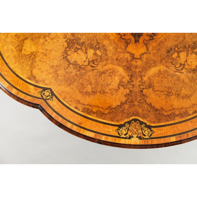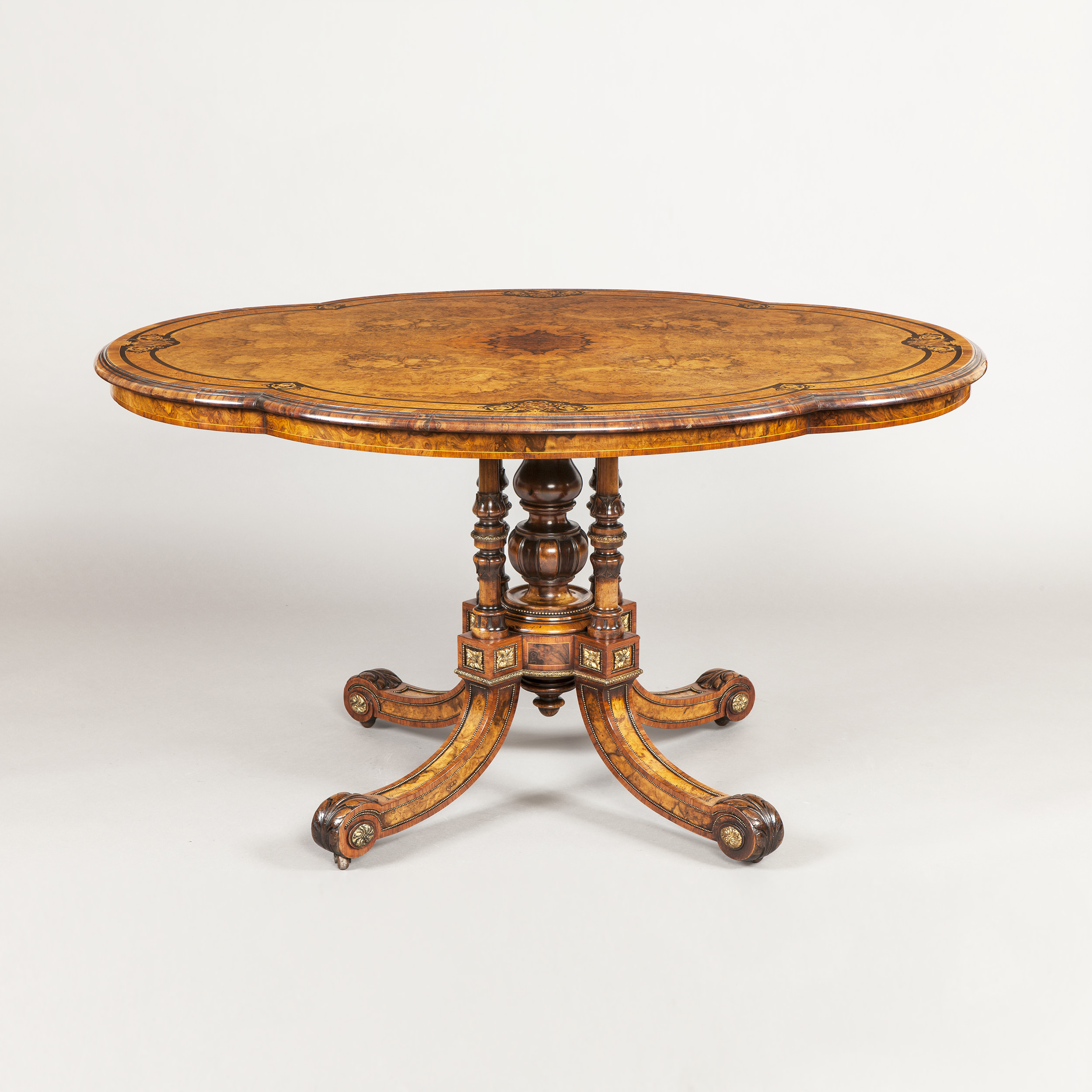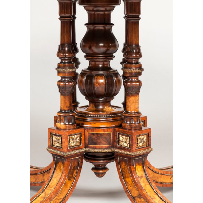 Constructed in Circassian walnut, with specimen woods inlays, and gilt metal adornments; rising from a castor shod scrolled leg quadripartite base, carved with foliates; a central shaped baluster form column is enclosed by four reeded upright supports at the cardinal points; the platform of serpentine shape, having a specimen wood guard band, depicting foliates and flambeaux, within the splendid book-matched walnut veneers.