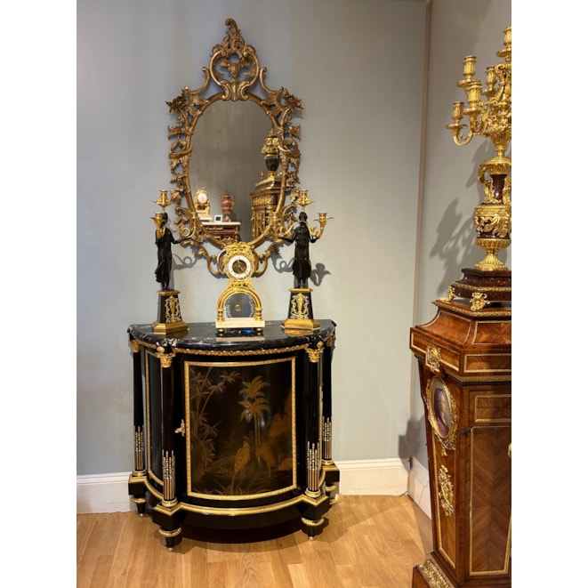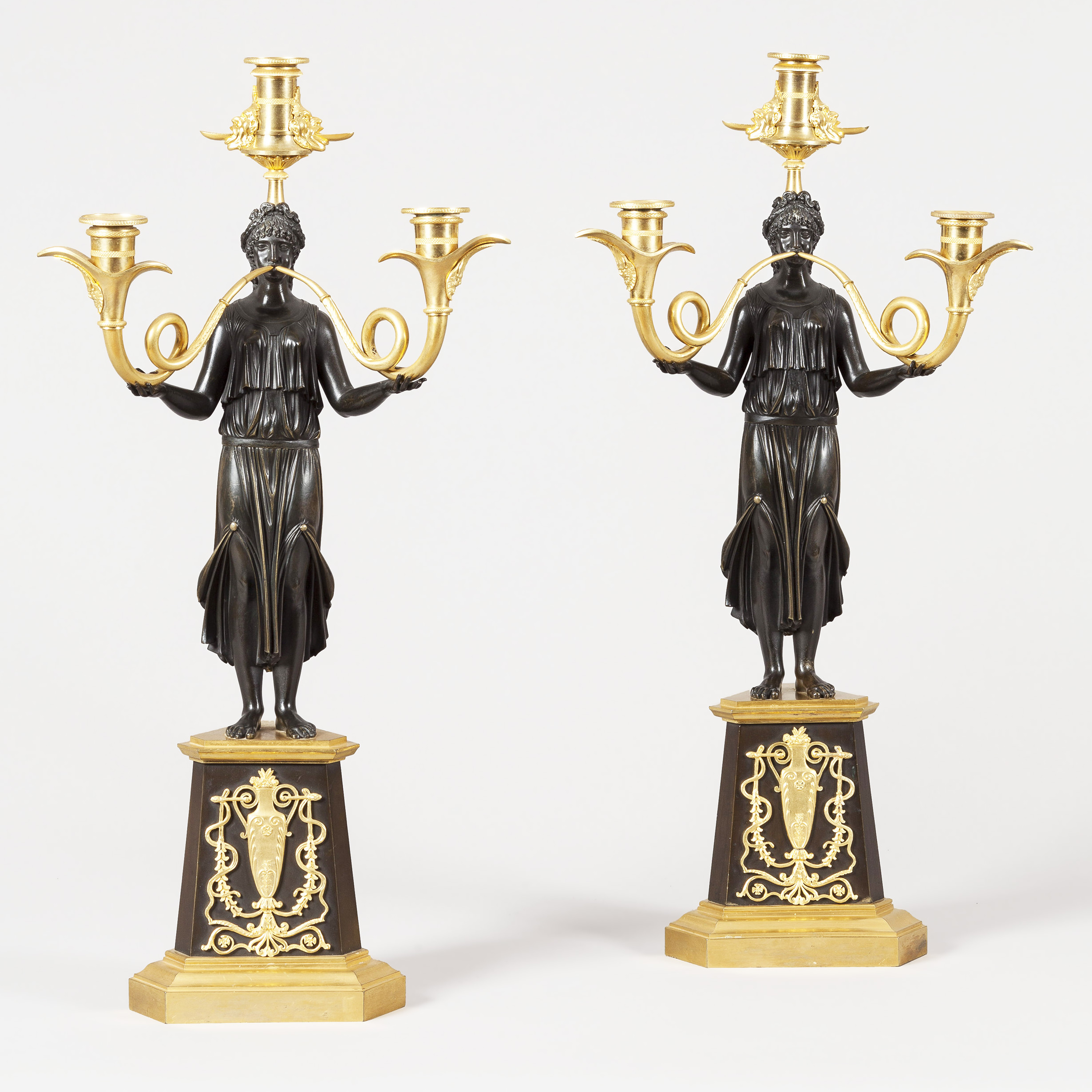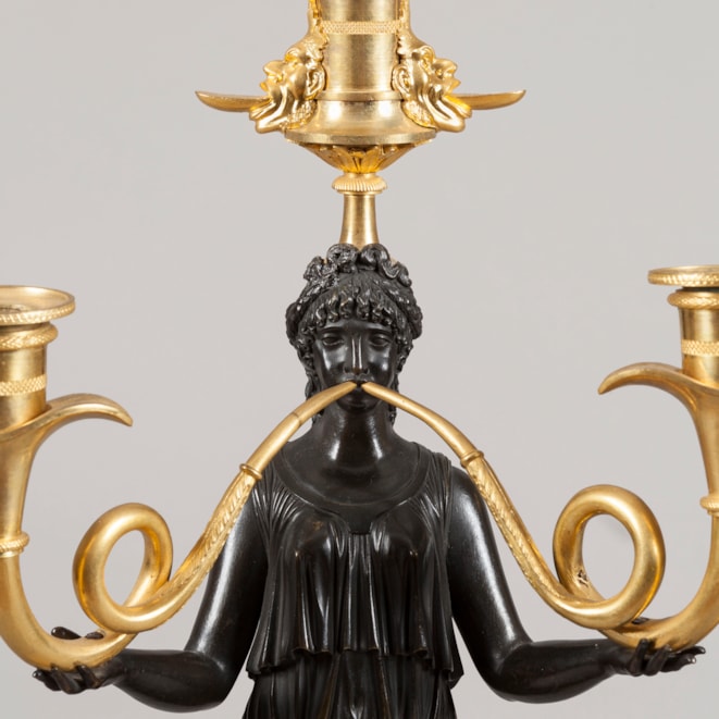 Constructed in two colour gilt and patinated bronze; the feminine Grecian figures draped with diaphanous robes blowing bi-form trumpets of swept form, terminating in candle holders, and capped with single candlesticks, dressed with grotesque masks, standing on triangulated bases having canted angles and dressed with stylised amphorae and anthemions. French, Circa 1815