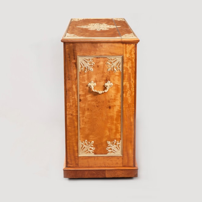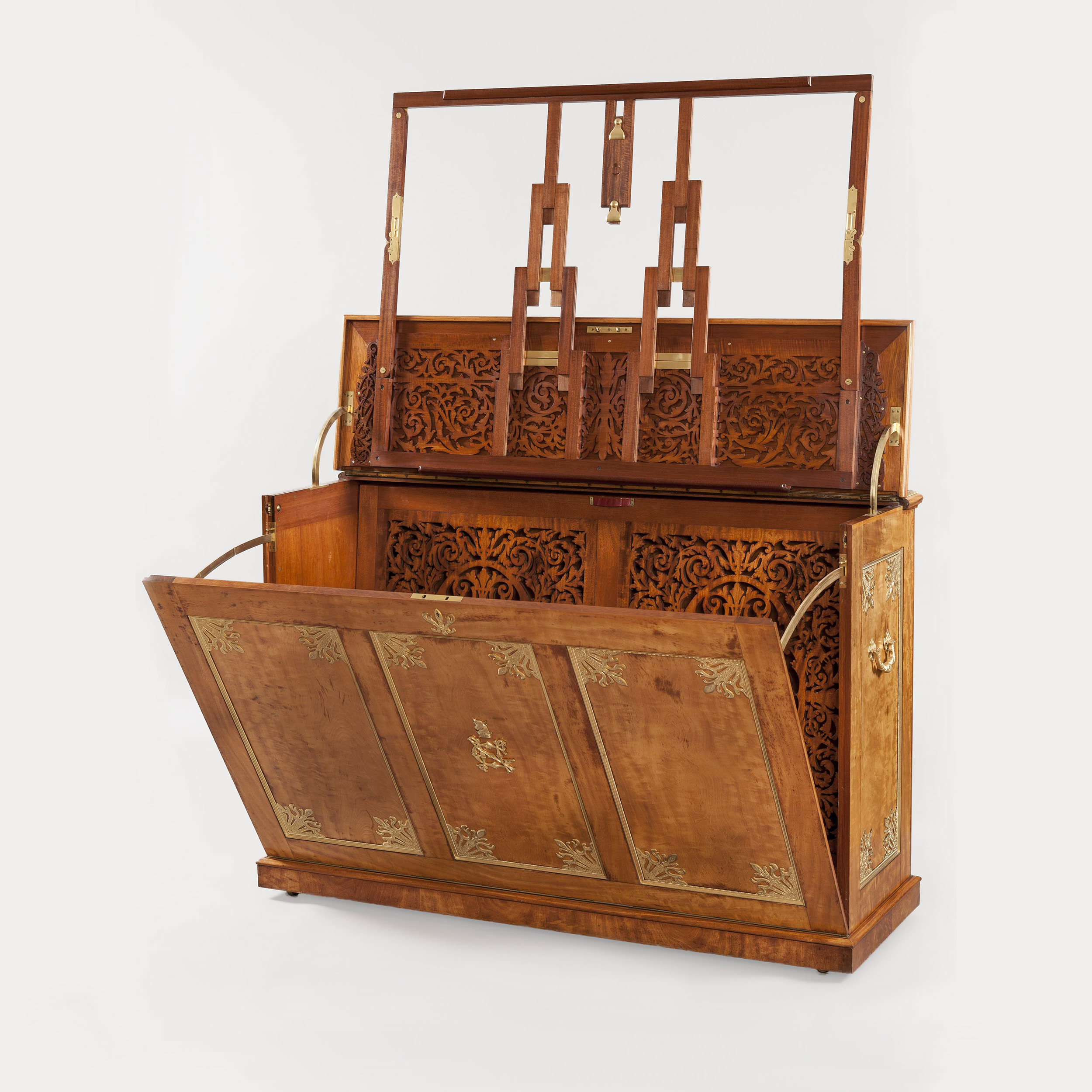 Of free standing form, constructed in satinwood, extensively adorned with engraved brass strapwork, carrying handles to the sides, the initials 'CN' and the family crest, a Bull's Head issuing from a ducal crown; rising from a plinth base, having a lockable rising top, and hinged triple panelled facia opening to reveal a fiddle back mahogany fretwork divider, and a remarkably engineered folio support and display arrangement.