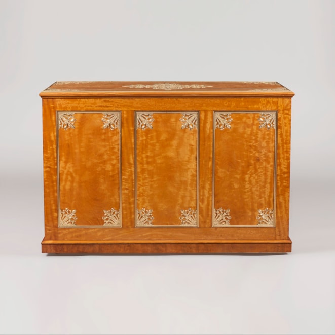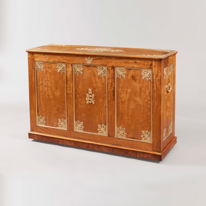 Bearing the family crest of the Nevill Holt family and the initials "C.N." denoting a custom commission most likely for Cosmo George Nevill (1823-1896), the last heir and owner of the family seat in Leicestershire. Mention of a great house standing here goes back to the year 1302, with significant additions and alterations throughout the centuries. From 1829-1832, the great architect J.B. Papworth started introducing gothic details to the house, a theme which clearly continued in its interiors as seen on the present folio cabinet which was probably commissioned when Cosmo inherited the estate in 1848. The estate was sold at auction in 1868.