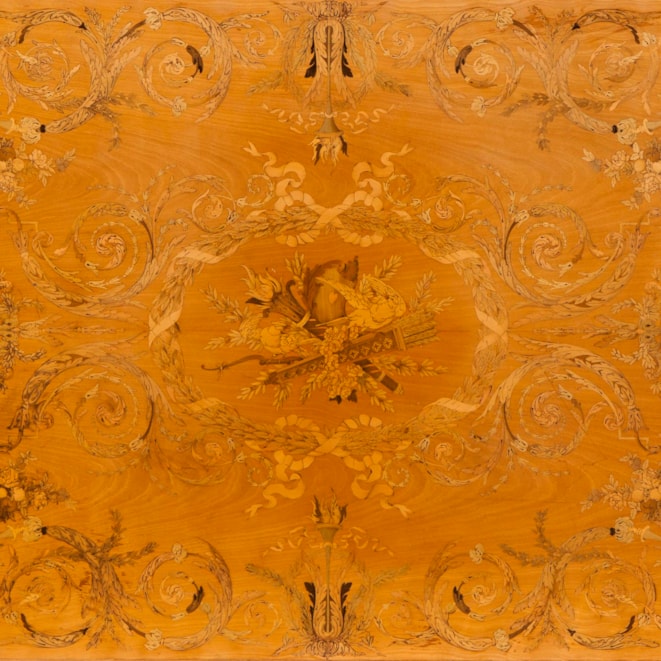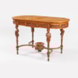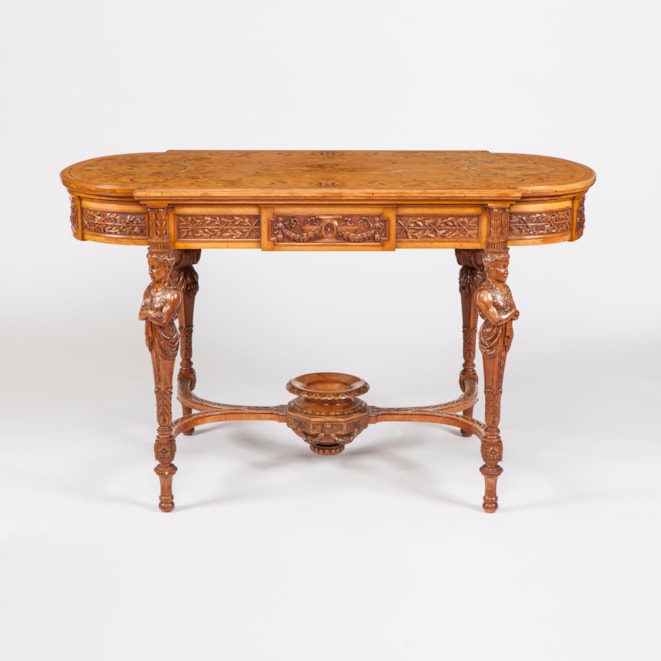 Of rectangular bow ended form, constructed in satinwood, and inlaid with specimen wood marquetry work on the platform; rising from toupie feet, the four finely carved caryatid female supports have a conjoined stylised 'X' form stretcher with a dished bowl at the centre; the apron housing a series of foliate carved entablatures, and the platform extensively inlaid with neo-classical designs of trophies, and floral arabesques. Bearing a label underneath the platform with the makers' name.