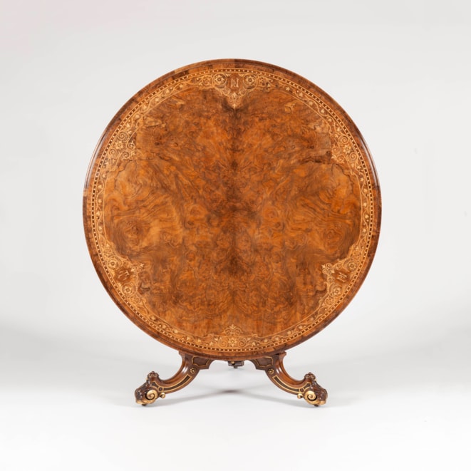 Constructed in walnut, with detailed marquetry inlay work, and brass and gilt highlights; rising from a castor shod tripartite knurled and scrolled cabriole legged base issuing turned, tapering and carved columns supporting the tilt-top platform; the circular top of finely figured Circassian walnut inlaid with floral arabesques. the lower rim having a bronze running pearl border. Stamped to the underside 'Johnstone & Jeanes'.