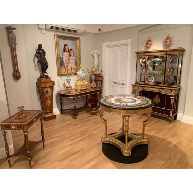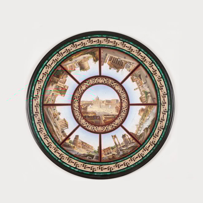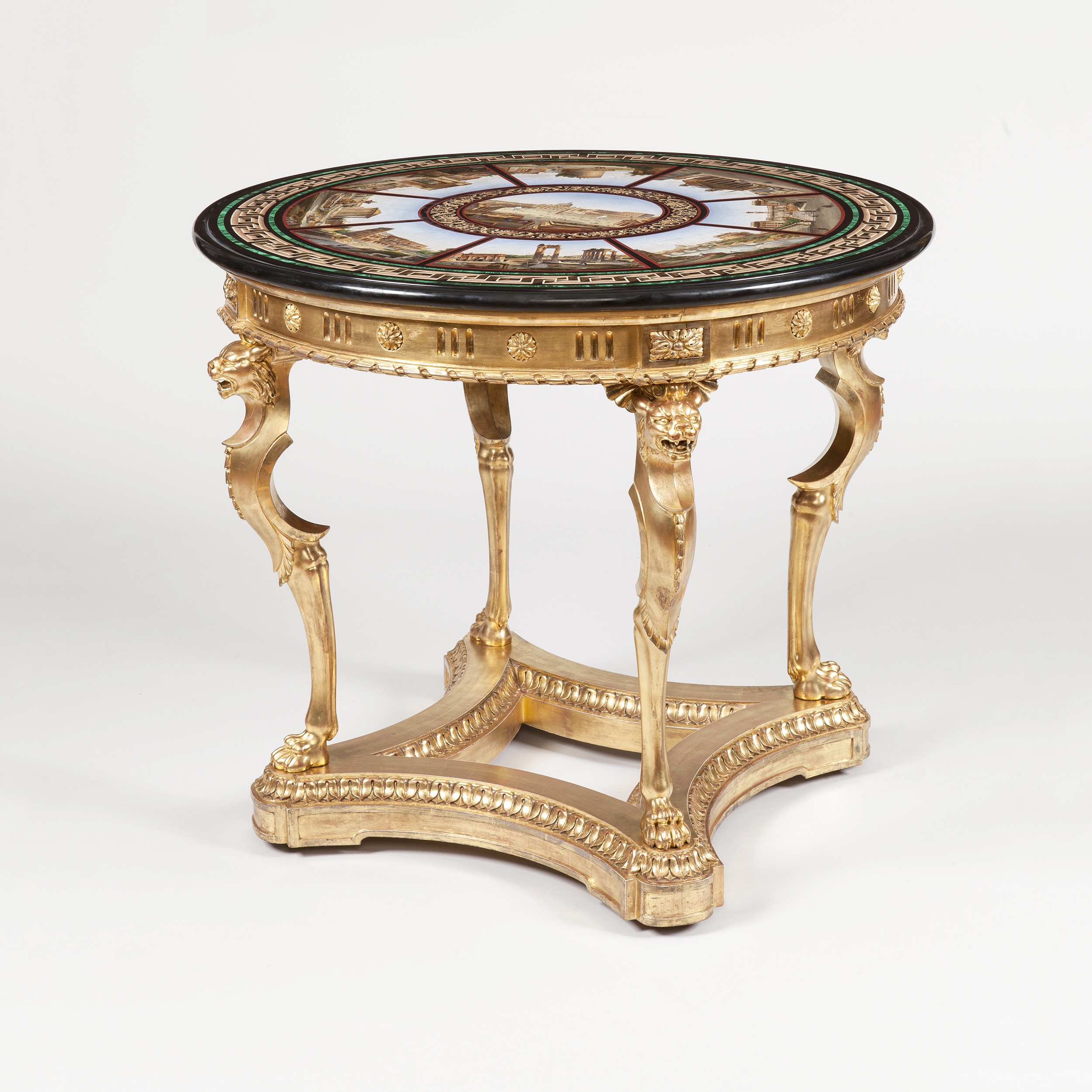 The carved gilt wood base in the manner of George Smith having four monopedia supports, each depicting leopards heads atop, with paw feet below, and conjoined by an incurved stretcher base having carved stiff leaf decoration, and raised on castors; the circular platform of marmoro nero, with a stylised Greek Key border within double Malachite reserves; the central micromosaic roundel depicts The Vatican from St Peter's Square, surrounded by eight separate roundels of The Pantheon of the Gods; the smallest of Rome's seven hills, the Capitoline; The Mauseoleum of Hadrian on the Tiber; The Roman Forum, with the remnants of the Temple of Vespasian; The Colosseum; the Temple of Vesta; The Arch of Titus, and the Tomb of Cecilia Metella.
