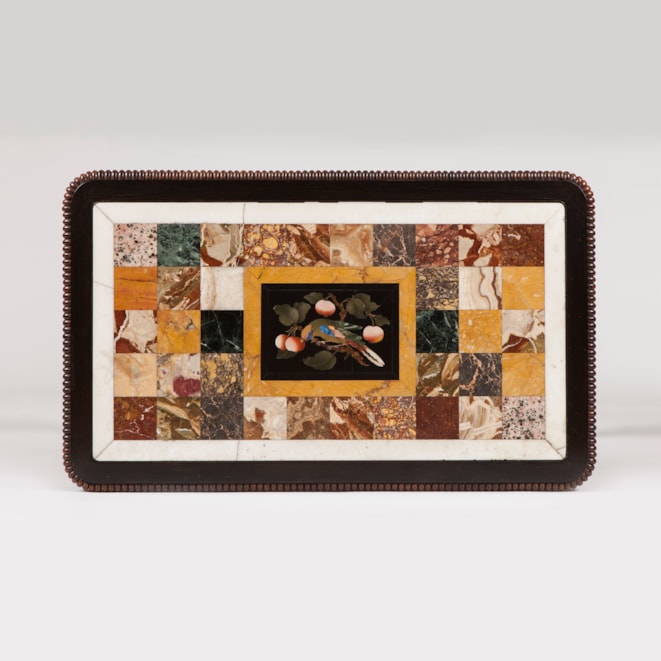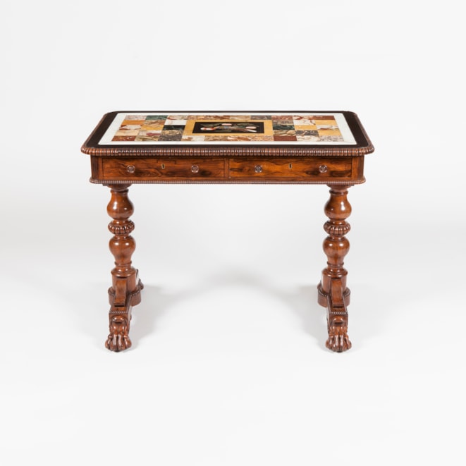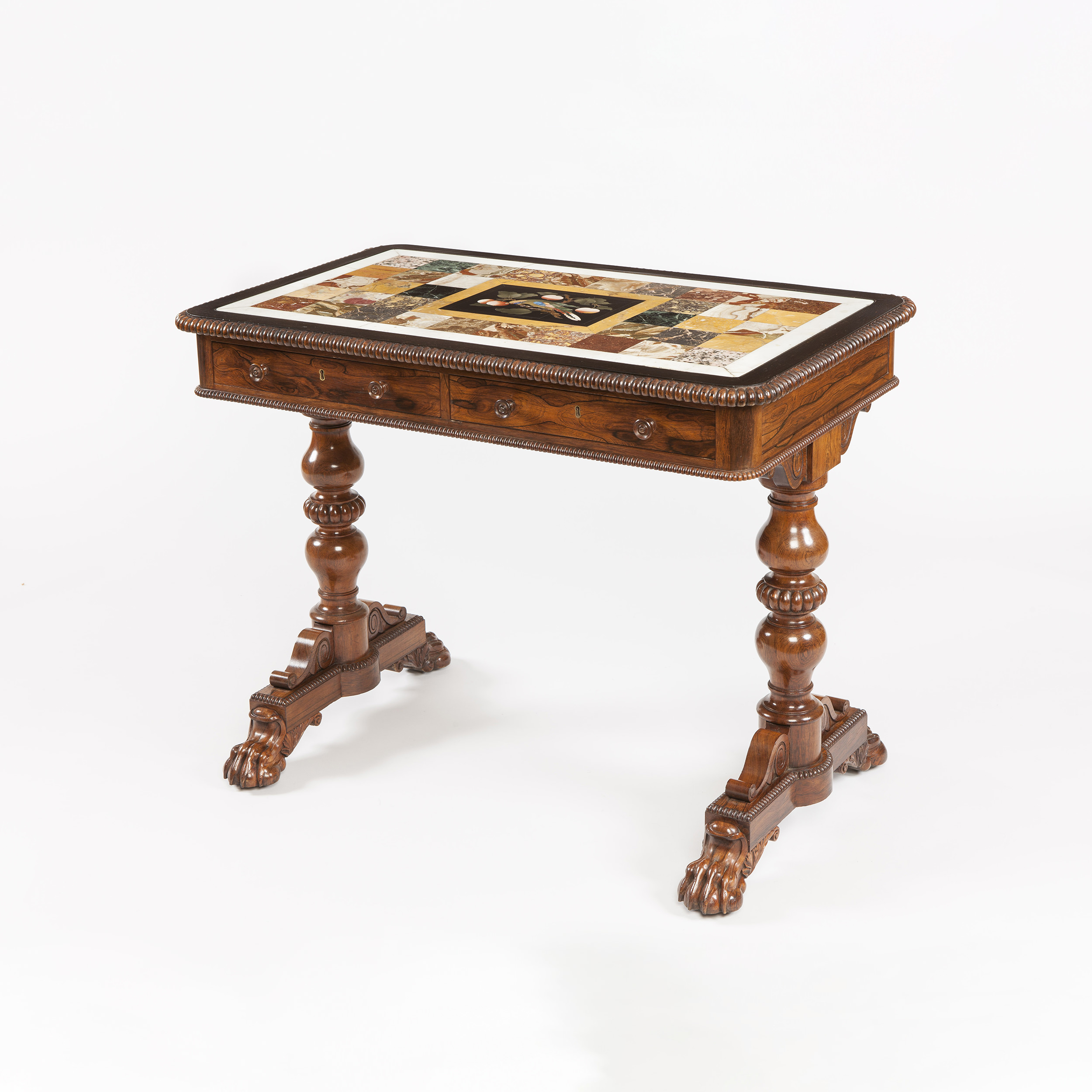 Constructed in goncalo alves, having an inset Florentine pietra dura platform; of free-standing, turned and tapering end support form, with inset castors to the bipartite scrolled block bases, with claw feet; the apron having two drawers, fitted with turned wood handles, and two faux drawers to the obverse; the rectangular radiused corner platform has a running gadrooned edge, and houses the Florentine top, set with a central panel showing a bird in a peach tree, and examples of specimen marbles including Lapis Lazuli, Sienna Gallo, Verona Red, and Roman Breccia, inter alia. Circa 1825
