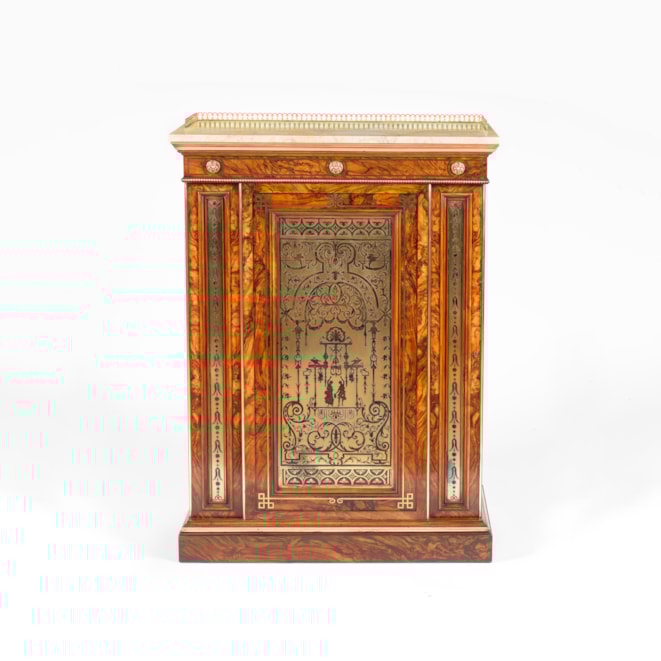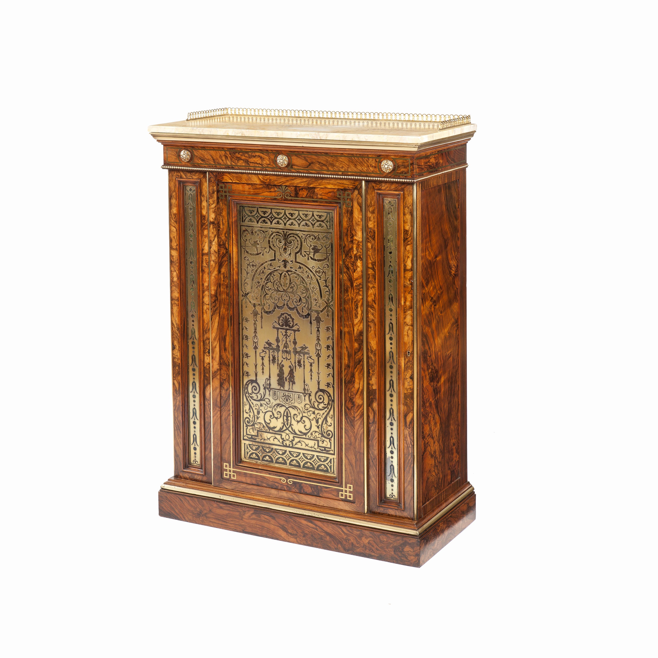 Constructed in a strongly grained olivewood, and dressed with brass inlays and an etched & engraved brass panel; rising from a plinth base, the lockable single door having an inset panel in the manner of Jean Berain, enclosing a shelved interior, and flanked by narrow vertical conforming panels; the apron being dressed with three bronze rosettes, and the Jura Jaune marble is dressed with a three quarter arcaded brass gallery.