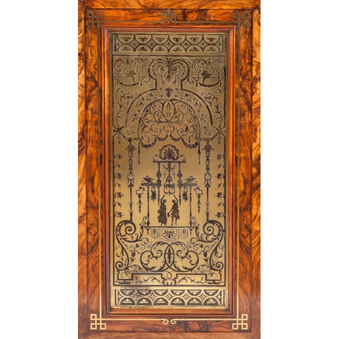 The cabinet is illustrated and discussed in Christopher Payne’s “British Furniture 1820 to 1920” published in 2023. Payne singles out the rarity of the olivewood timber used as well as the necessity for hand cutting the large marquetry panel.