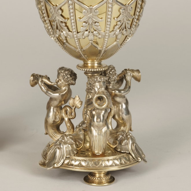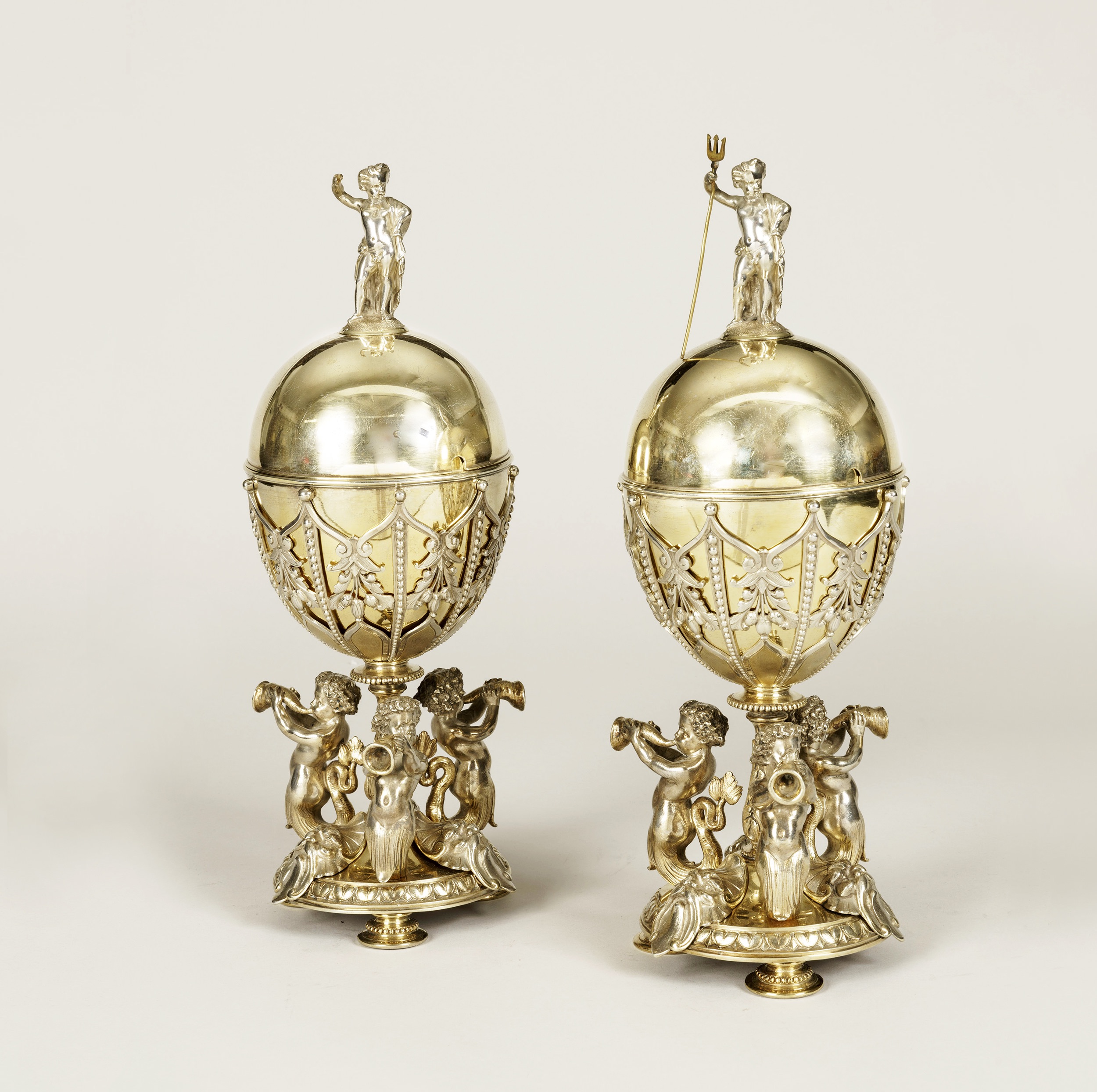 The silver-plated vases bear to the underside, Elkington & Co marks, and the date letter for 1873. The circular bases rise on three spun feet, having three tritons blowing on conch shells set about central columns; the ovoid lidded bodies are decorated with tracery, have inlets for spoons and are surmounted by models of the young Poseidon, holding tridents.