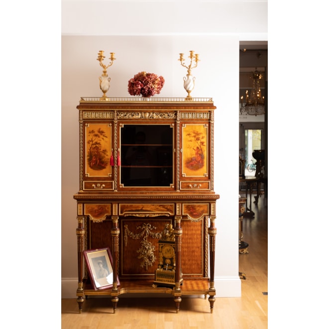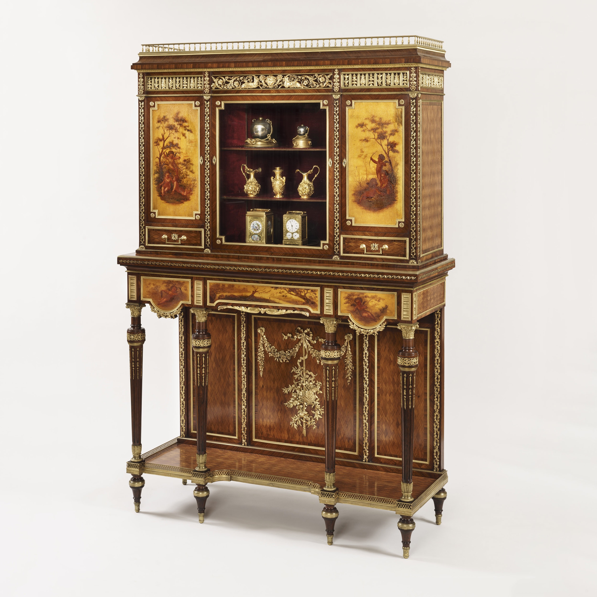 Constructed in Kingwood and Mahogany, with extensive decoration of high quality ormolu work, and Vernis Martin painted doors; of rectangular form; rising from turned and tapering toupie feet supporting n inverted breakfront parquetry decorated lower tier, dressed with a running trellised pierced gallery; the shaped apron houses a central drawer, the fascias decrated with Vernis Martin bucolic scenes, dressed with ormolu, is supported by turned and tapering cannellure legs, with pendant ormolu bellflowers; over, a central vitrine lockable door houses a felt lined interior, and the flanking lockable Vernis Martin painted doors enclose shelved interiors, with drawers below, housed within ormolu foliate uprights, with the pediment decorated with extensive ormolu work; atop, an ormolu balustraded gallery. Bearing a part label, 'Ebénisterie de Luxe, Grimard, Paris'.