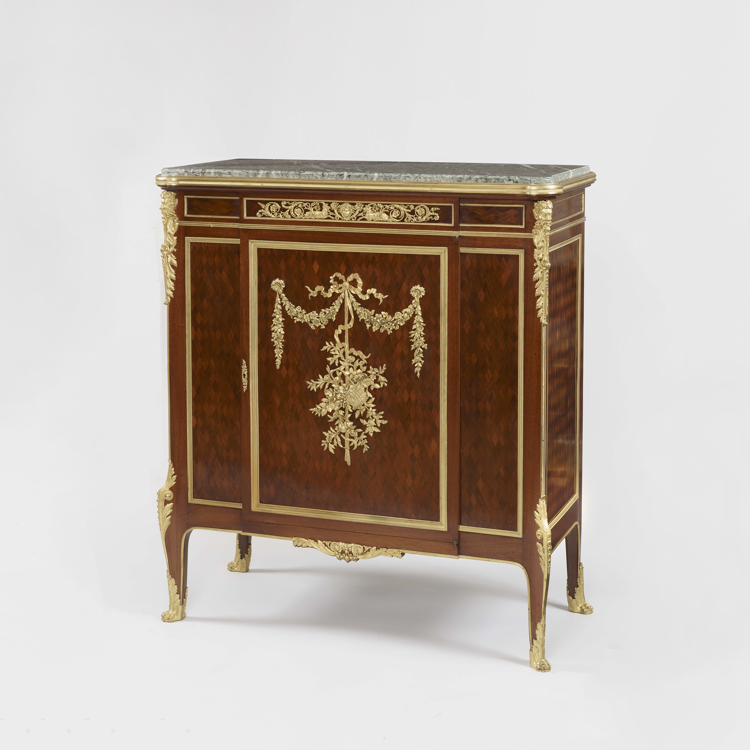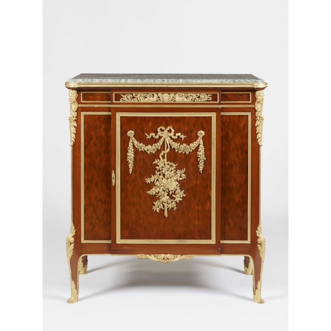 Constructed in the Louis XV transitional manner, in mahogany parquetry work, and dressed with ormolu mounts of the finest quality, with a Breccia Verde marble platform' rising from swept cabriole legs, with ormolu sabots and foliate clasps to the knees, the cabinet is of gentle breakfront form, and having a single door, with a rich foliate ormolu pendant bouquet with swags and a 'lovers knot' bow over; male mask ormolu espagnolettes to their upper angles, with a rectangular pictorial motif to the apron of disporting putti; the marble platform, with a gentle thumbnail moulding over. Signed by the maker 'F. Linke.'