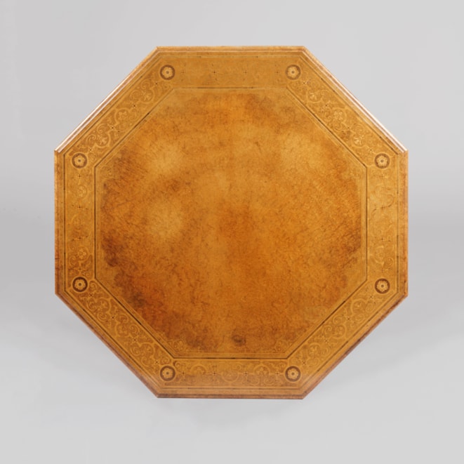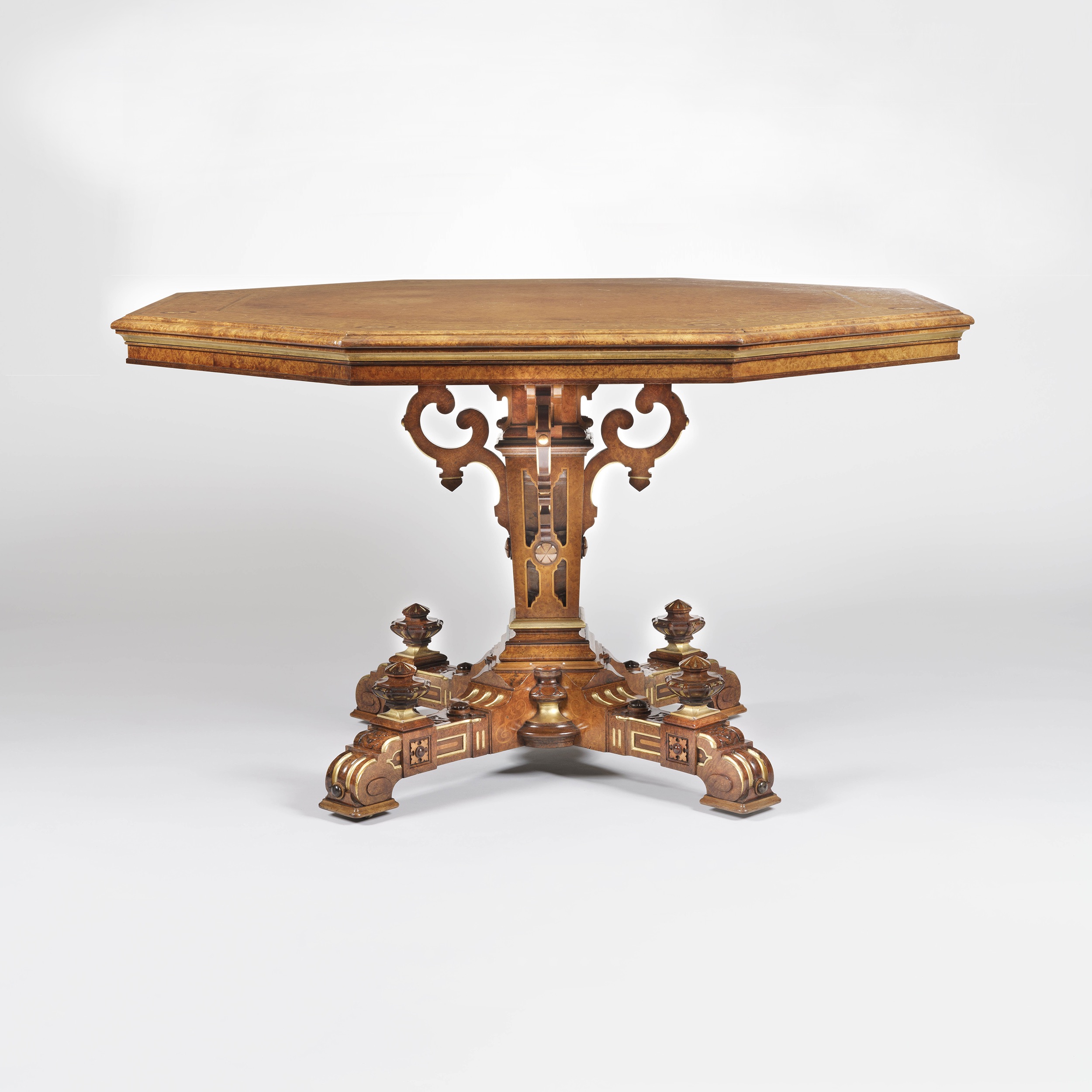 Constructed in amboyna, with extensive marquetry inlays in specimen woods, and enhanced with parcel-gilt highlights. Rising from a cruciform platform base adorned with knops, and having concealed castors, supporting the inlaid, and gently stepped and tapering centre column with stylised 'c' form brackets bracing the octagonal top, the outer guard band having English roses inlaid at the angles, with foliates with the national emblems of Scotland and Ireland, thistles and shamrocks. Stamped by the makers to the underside, 'Johnstone & Jeanes 67 Bond Street'.
