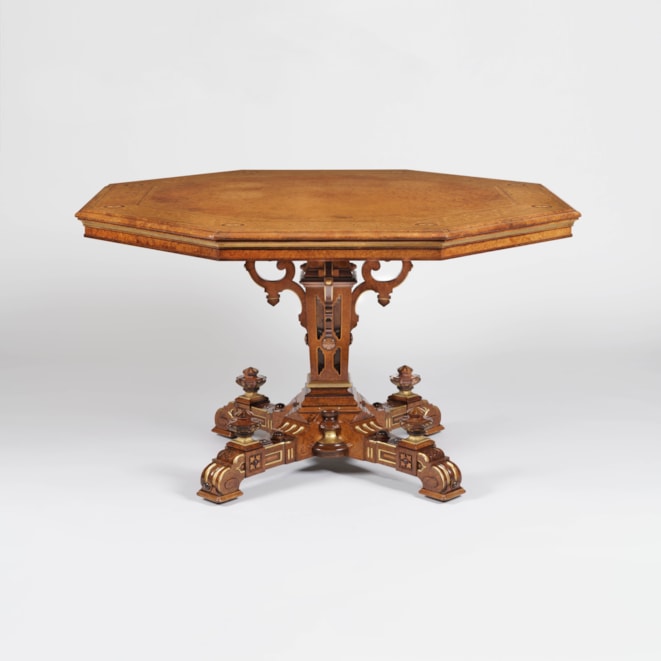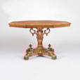 The company of Crace were designers and decorators to the Royal household from 1768 until 1899, working for every monarch from George the Third until late in the reign of Queen Victoria, and the idiosyncratic design of this table, with its' usage of national emblems suggests to us an affiliation with the Craces as designers and Johnstone & Jeanes as the makers, both participants and exhibitors at the 1862 Great Exhibition (at which they designed the Royal throne). The cruciform base appears in other pieces designed by the Craces.