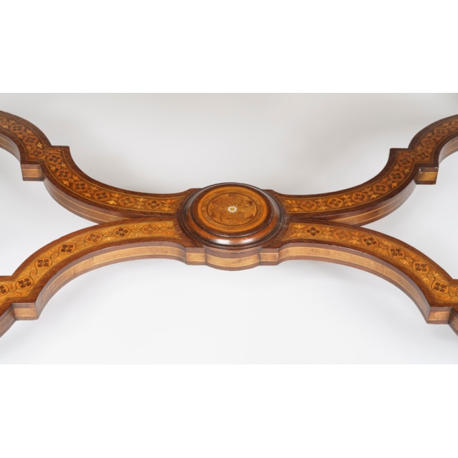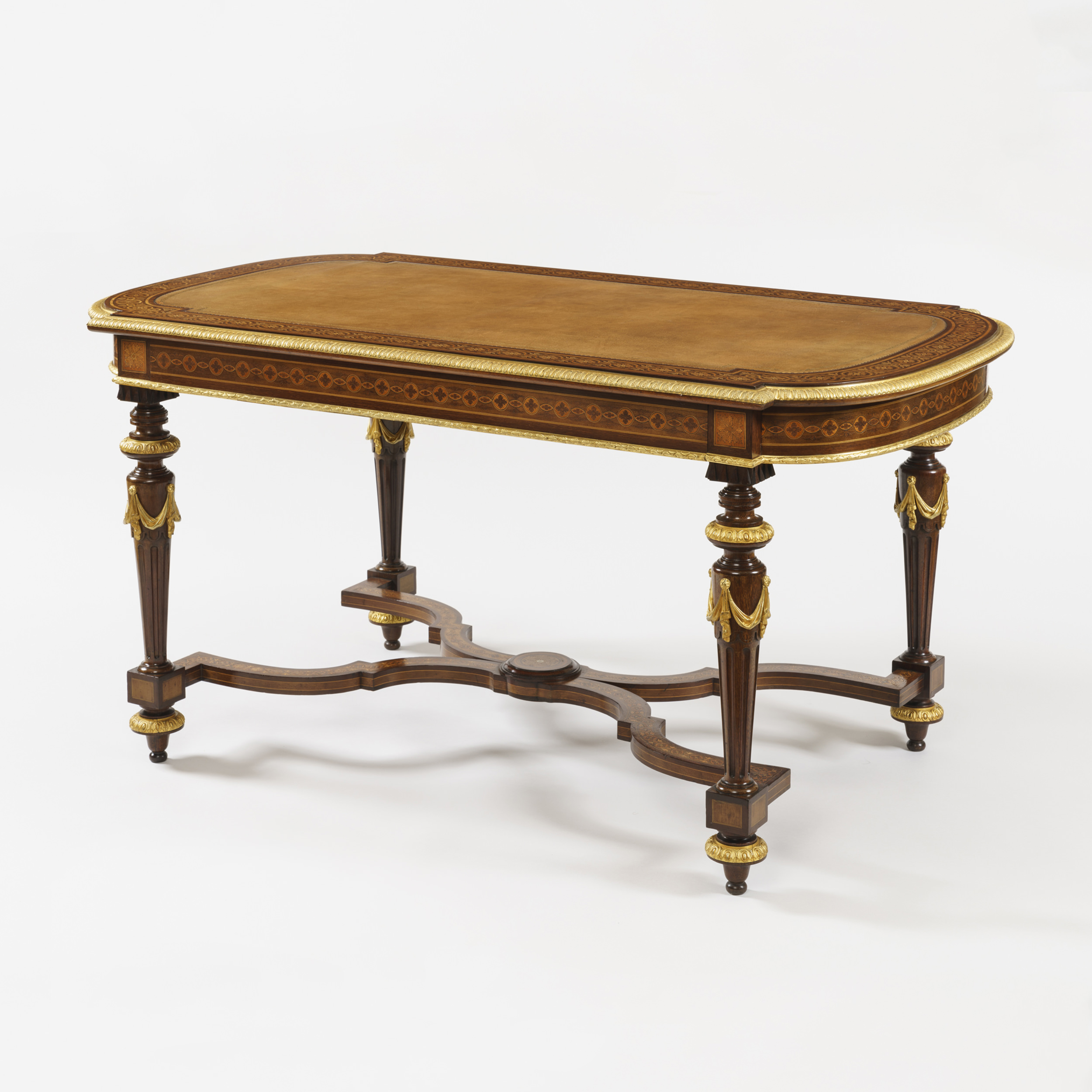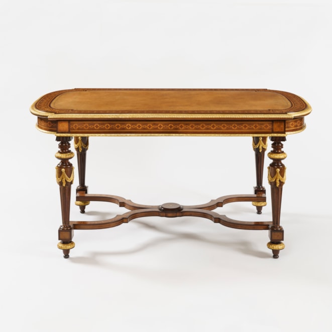 Constructed in mahogany, with specimen wood inlays, and gilt bronze mounts; of rectangular form, with bowed ends, rising from ring turned, fluted and tapering legs, adorned with bronze swags and ogee bands , and conjoined with a stylised and foliate inlaid 'X' form stretcher; the inlaid apron housing a single mahogany lined long drawer, with an inset morocco leather tooled top within an inlaid reserve, and having a bronze gadrooned guard edge.