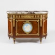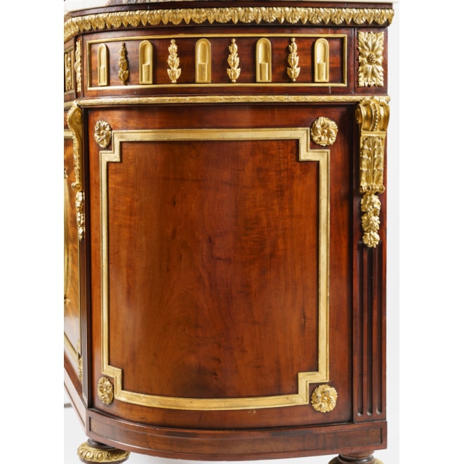 A fine commode a l'anglaise having a shaped marble top inset within a gilt-bronze border, above a frieze applied with finely cast gilt-bronze foliate mounts flanking a running pattern of alternating semi-hollow arched fluting and floral appliqués. Having a central drawer adorned with a central laurel wreath supported by winged putti. Below, a central cupboard with finely cast gilt-bronze circular egg & dart moulding supported by scrolling foliage and a lover's bow garland at its apex. The central door is flanked by carved fluted pilasters with anthemion scrolled ancones, the whole resting on fine tapering legs with gilt-bronze caps. The bronze mounts stamped 'ZJ', the marble a later replacement.