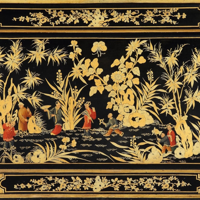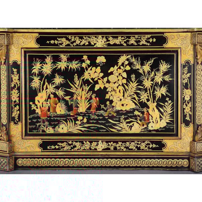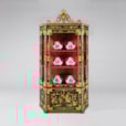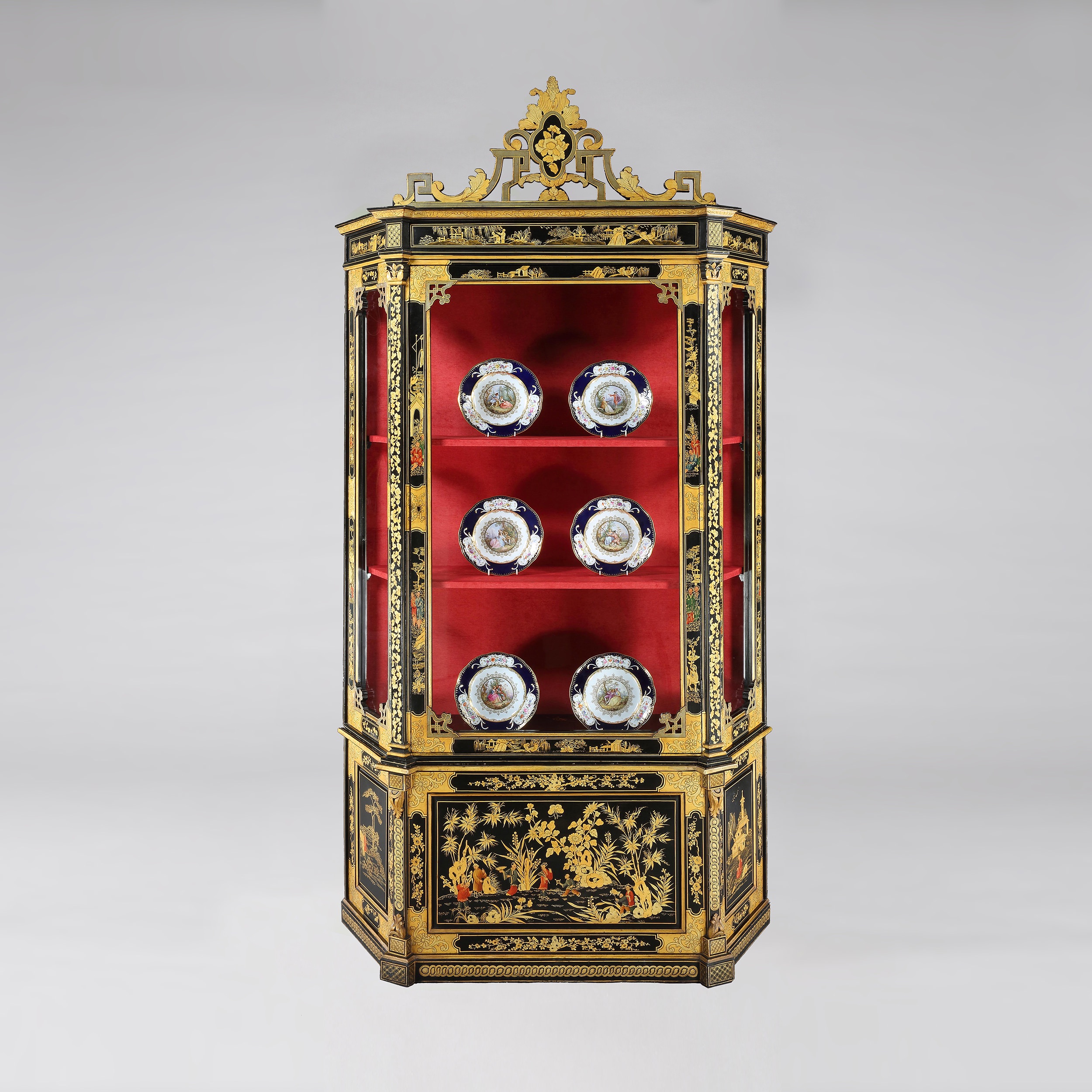 Extensively decorated in the Chinoiserie manner in giltwork and polychromes; rising from a plinth base, having canted sides, a central door to the lower section, revealing a shelved interior; the upper section glazed; surmounted by an ogee form cornice, and surmounted by a stylised Chinese motif.