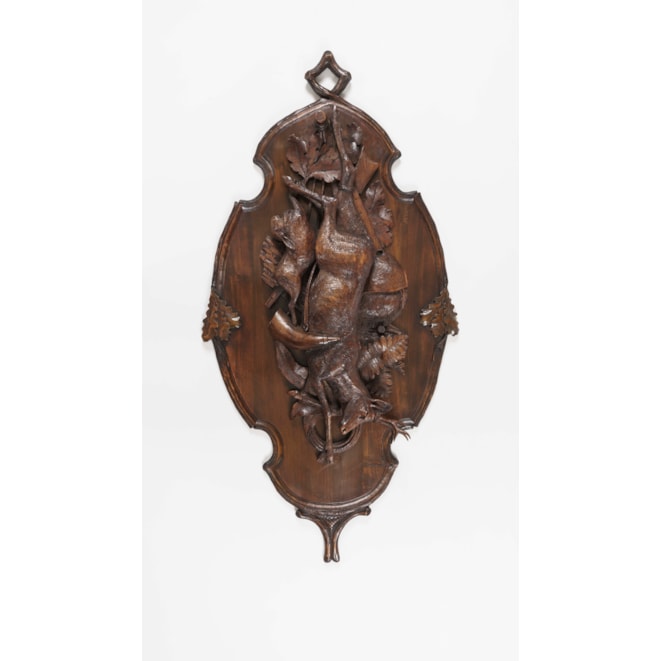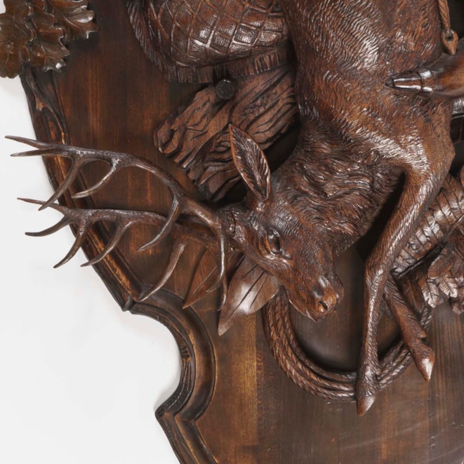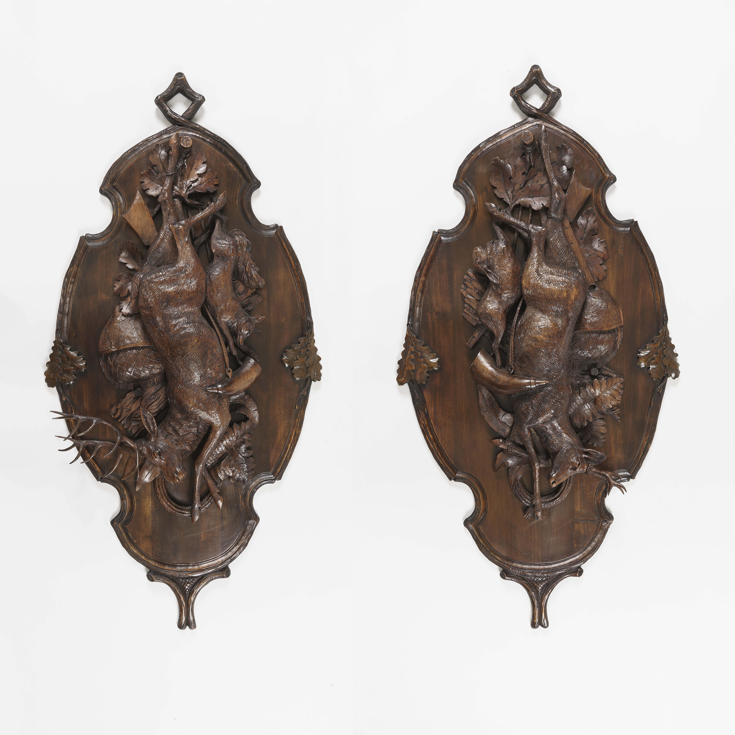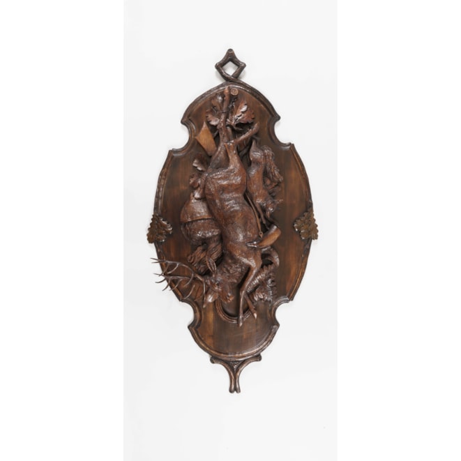 Expertly carved in Lindenwood, the shaped plaques, carved with oak leaves, depict a buck and a roe deer, a hare and fox, hung as trophies.