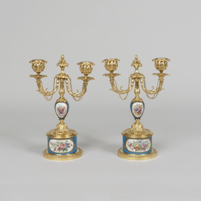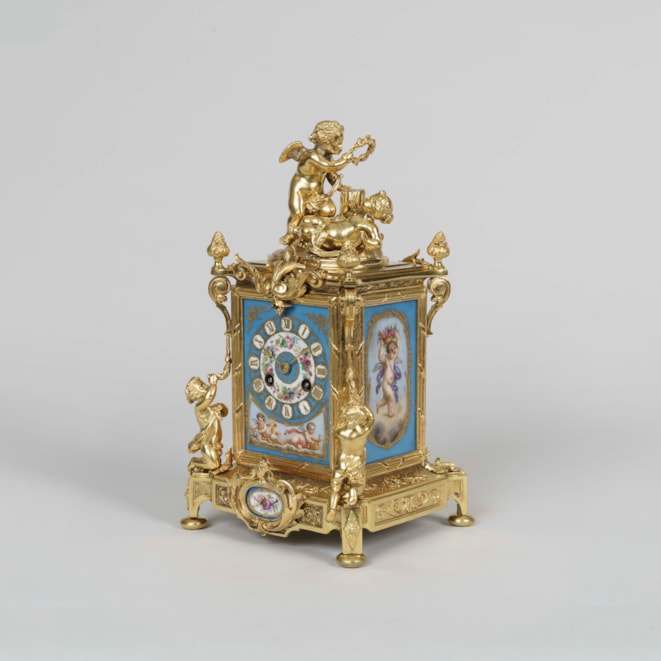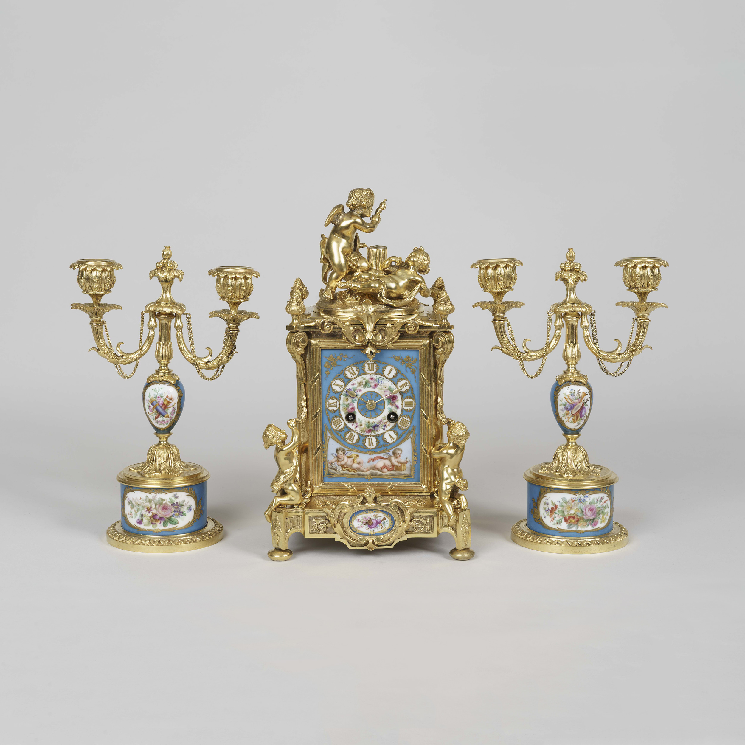 The ormolu clock case and accompanying candelabra dressed with blue 'Sevres' style hand decorated polychrome enamelled panels to the face and sides, depicting amorini, flowers, and musical instruments; the clock having volutes and fasces framing the face, with gilt painted borders and the hours delineated in Roman numerals; the two train movement has a Brocot escapement, enabling the eight day movement, and the hours are struck on a bell; with a pair of ormolu putti resting atop. The dial and backplate signed by the maker “Le Roy et Fils […] Regent Street […]” and “Le Roy et Fils,” respectively.