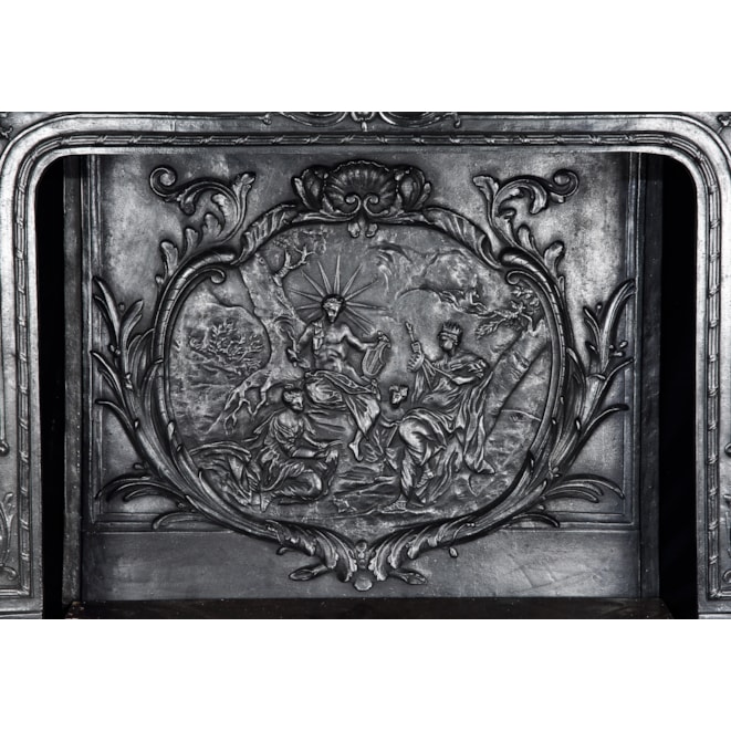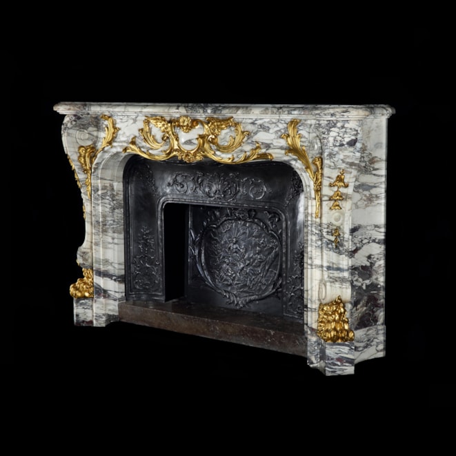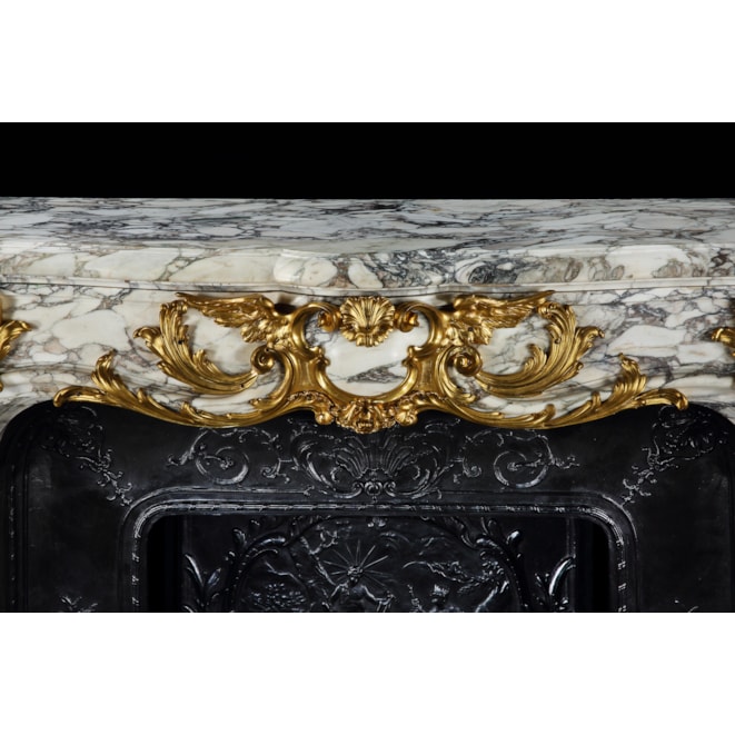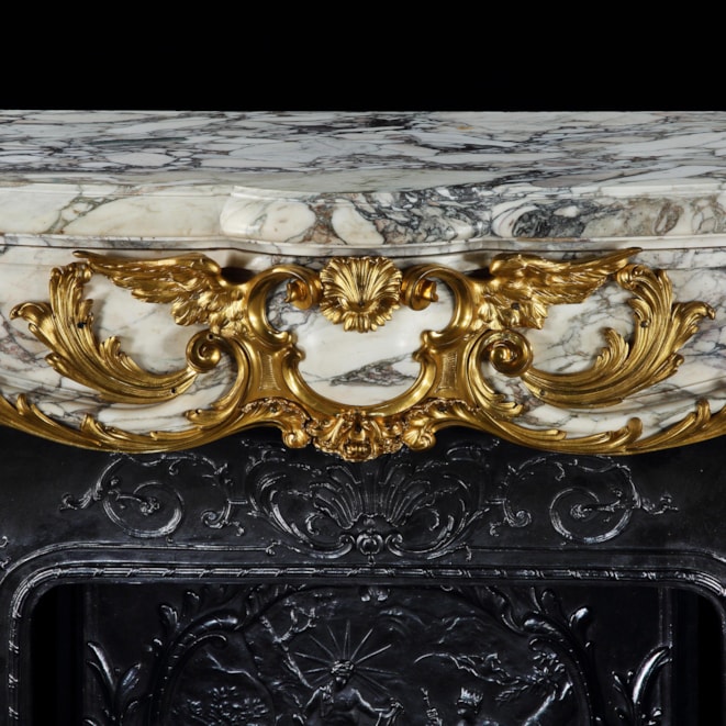 The imposing brèche violette marble fireplace dressed with exceptional gilt bronze mounts throughout, its canted corners giving rise to magnificent carved volute jambs raised on ormolu hairy paw feet, and supporting the serpentine shelf; the frieze adorned with a lavish central ormolu cartouche of a winged shell flanked by scrolling acanthus leaves. The wide serpentine opening housing the original cast iron backplate, depicting classical figures from ancient mythology including Apollo and Pegasus.