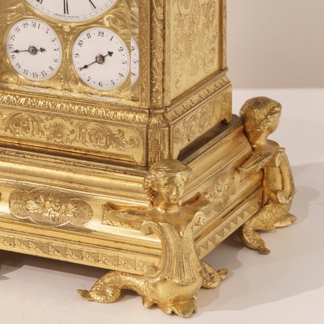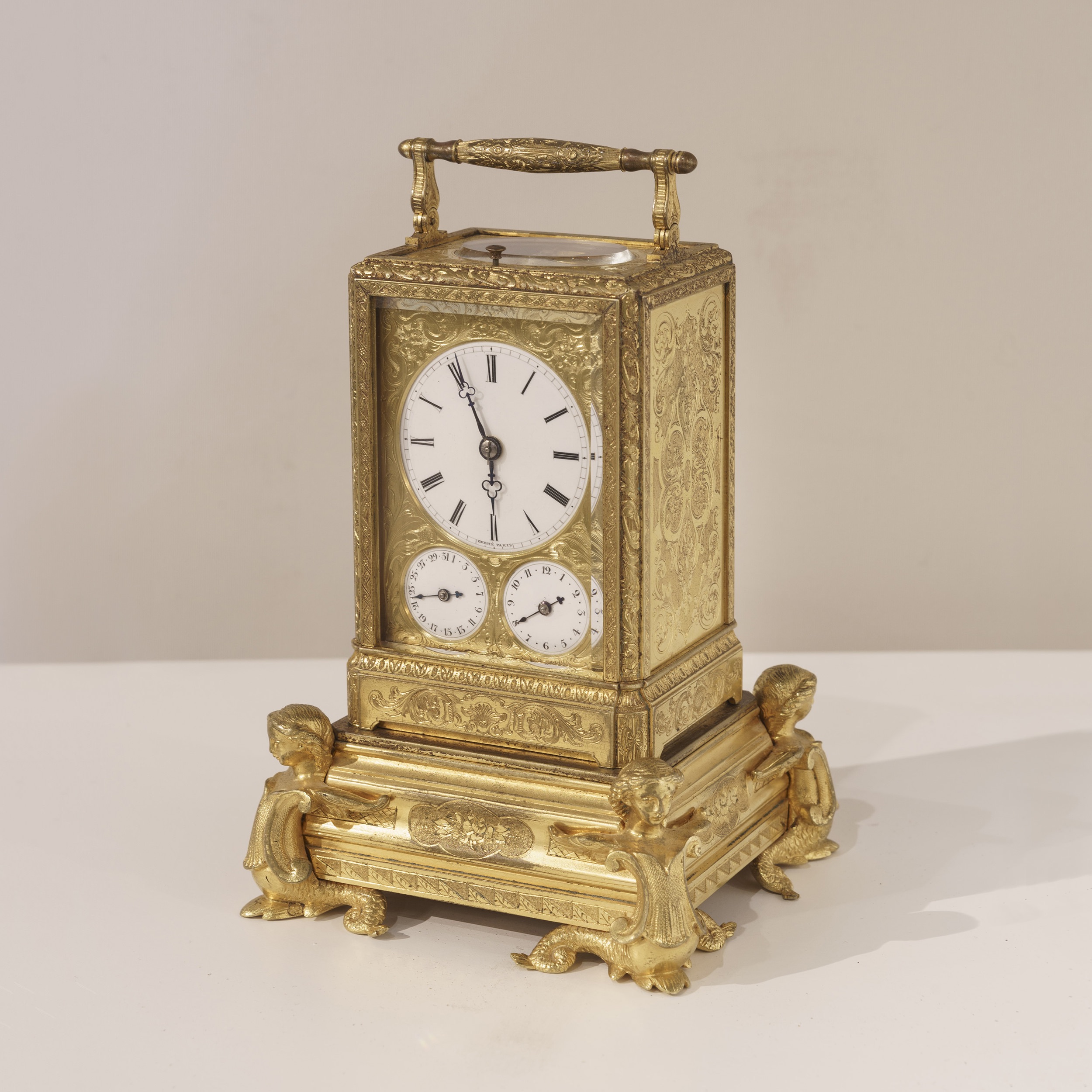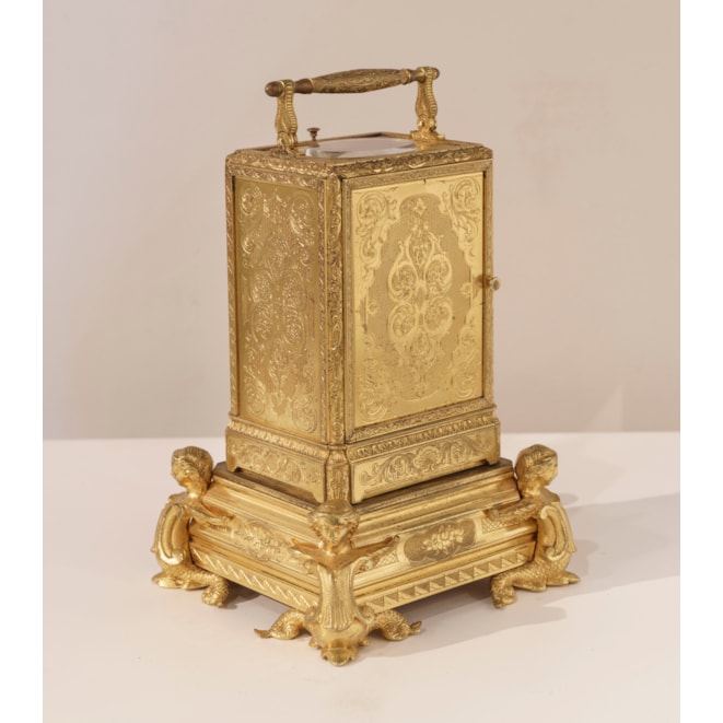The gilt bronze case comprehensively engraved, and having a retractable carrying handle; the lever movement driving the petit sonnerie movement, with the fascia indicating, on white enamel faces, the hours, days and months; having an alarm mechanism operated from the back and striking on a double gong. Complete with ormolu plinth and signed to the face, Grohe, Paris.