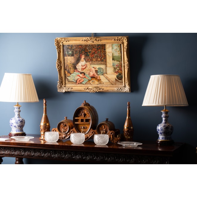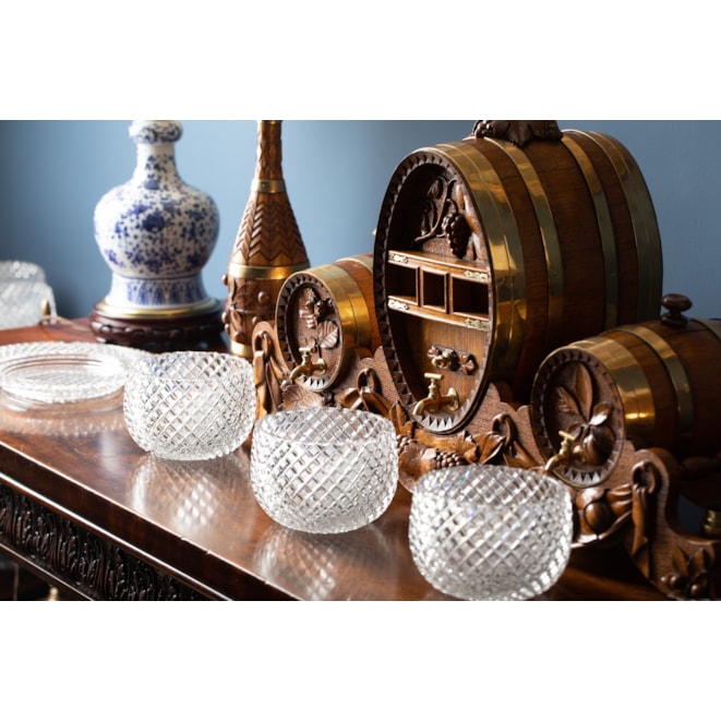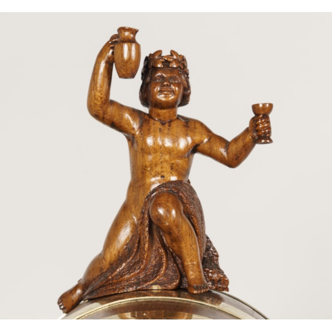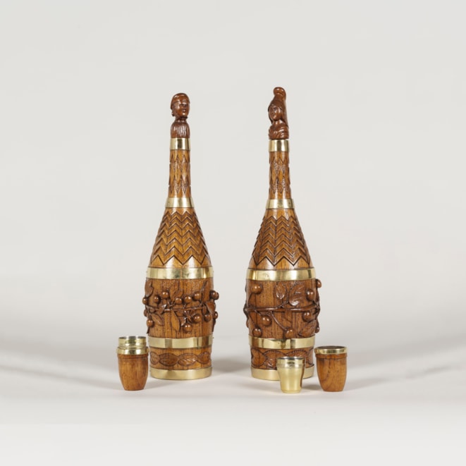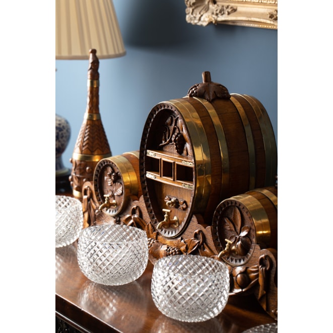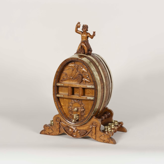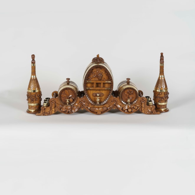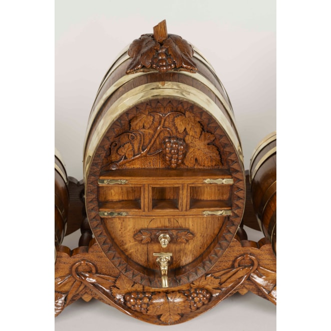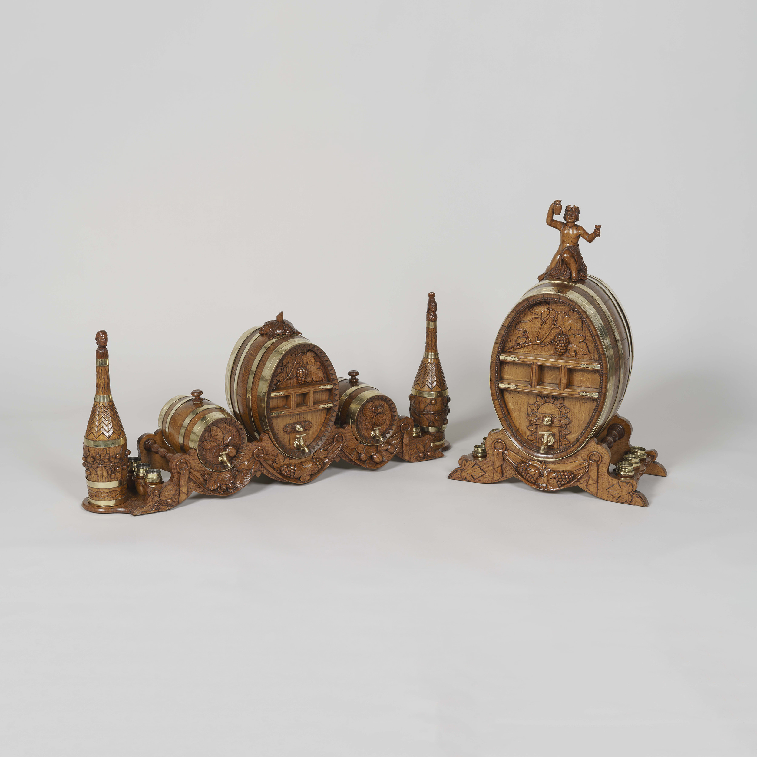Composed of four barrels and two carafes, with twelve silver gilt and oak glasses from the silversmith Odile Lamy, the entire set resting on carved chevalet supports with relief decoration of vine leaves and bunches of grapes; the circular and ovoid barrels with brass hoop fasteners; the front showcasing emblems of wine and inset with functioning taps; the largest barrel with a seated Bacchus—God of Wine—stopper, while the carafes of conforming decoration with cork stoppers of figural busts.