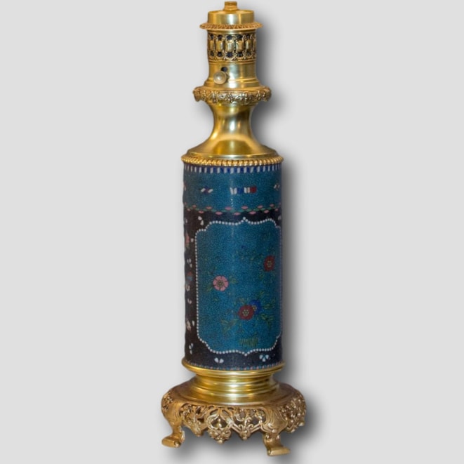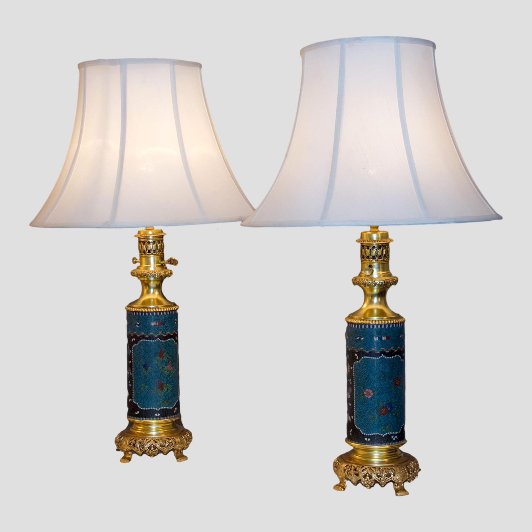 Pair of cylindrical Lamps in Cloisonne with chinoiserie gilt bronze mounts