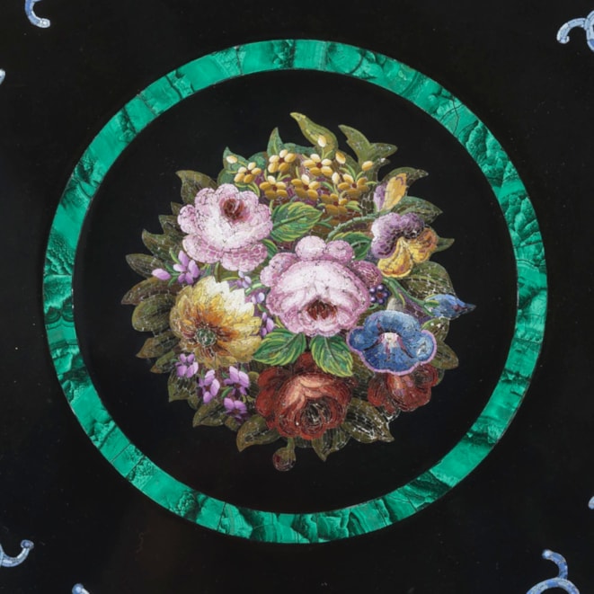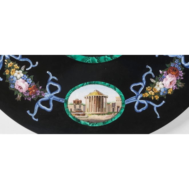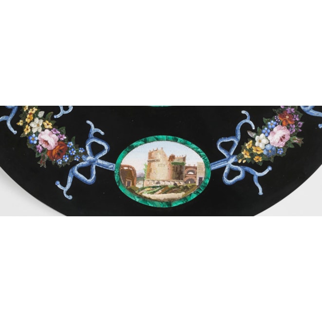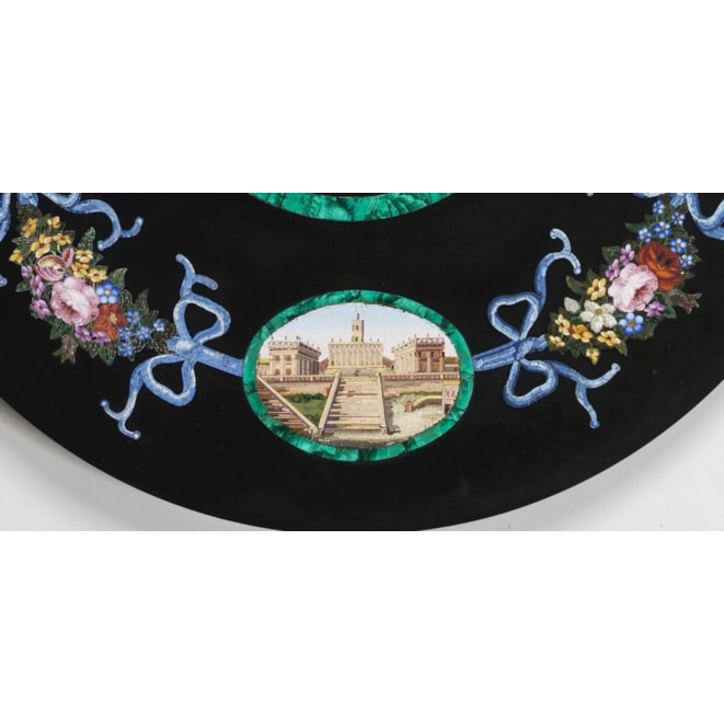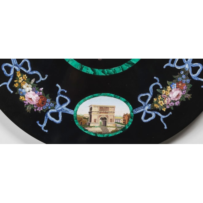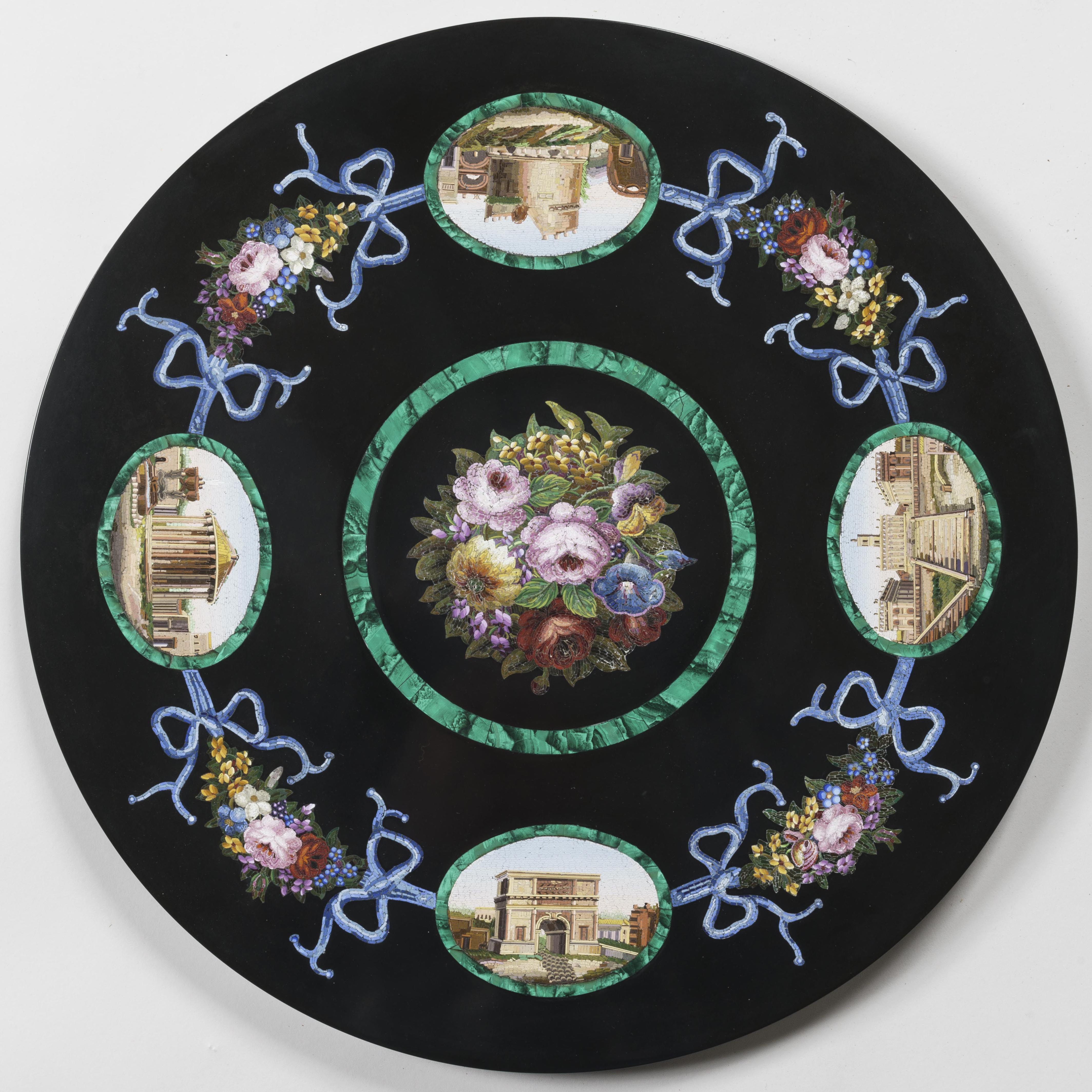 The circular platform of marmore nero, inset with fine micromosaic panels consisting of hundreds of coloured glass tesserae; a central flower bouquet sit within a malachite border surrounded by a border including four cartouches in conforming malachite reserves representing Roman views including the Arch of Titus, the Temple of Vesta, the Capitoline Hill, and the Tomb of Cecilia Metella, connected by floral garlands.