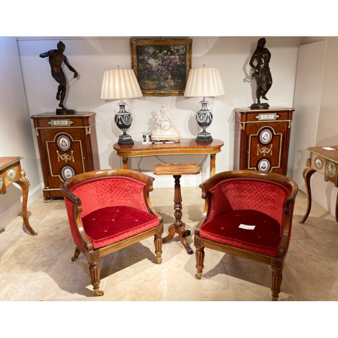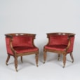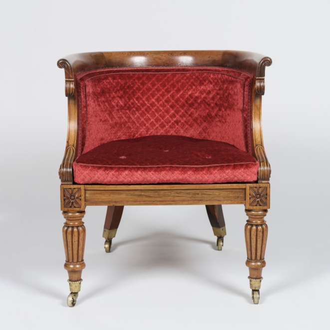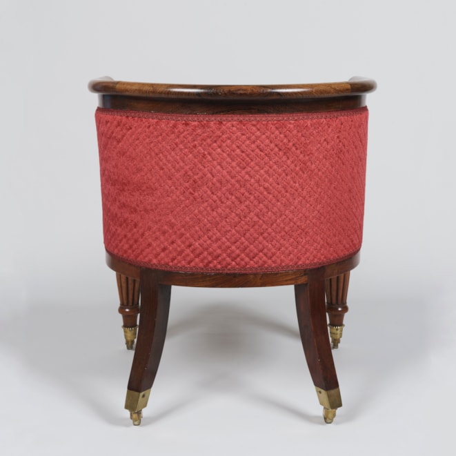 The design for this pair of tub chairs is derived from Thomas Sheraton’s Cabinet Dictionary, published in 1803. His influential designs may have inspired Thomas Hope—the father of interior decoration-- to design his own version in 1807.