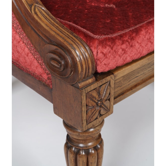 Constructed from rosewood, the chairs with curved backs supported on reeded front legs and splayed legs to the rear, each with brass casters, the front rail blocks with carved paterae, issuing scrolling lappet volutes and exposed solid rosewood backrails. Each chair stamped with the journeyman’s initals “I.M.”