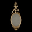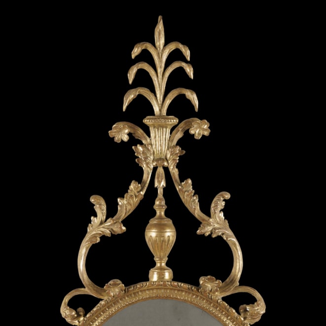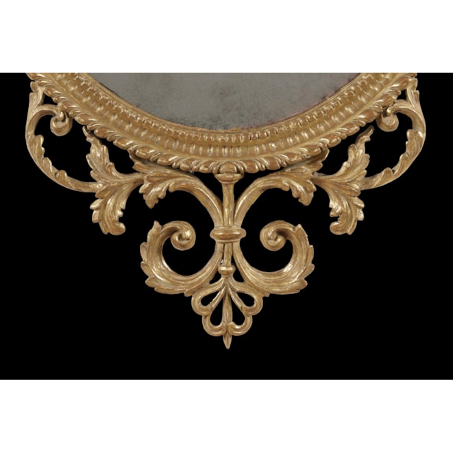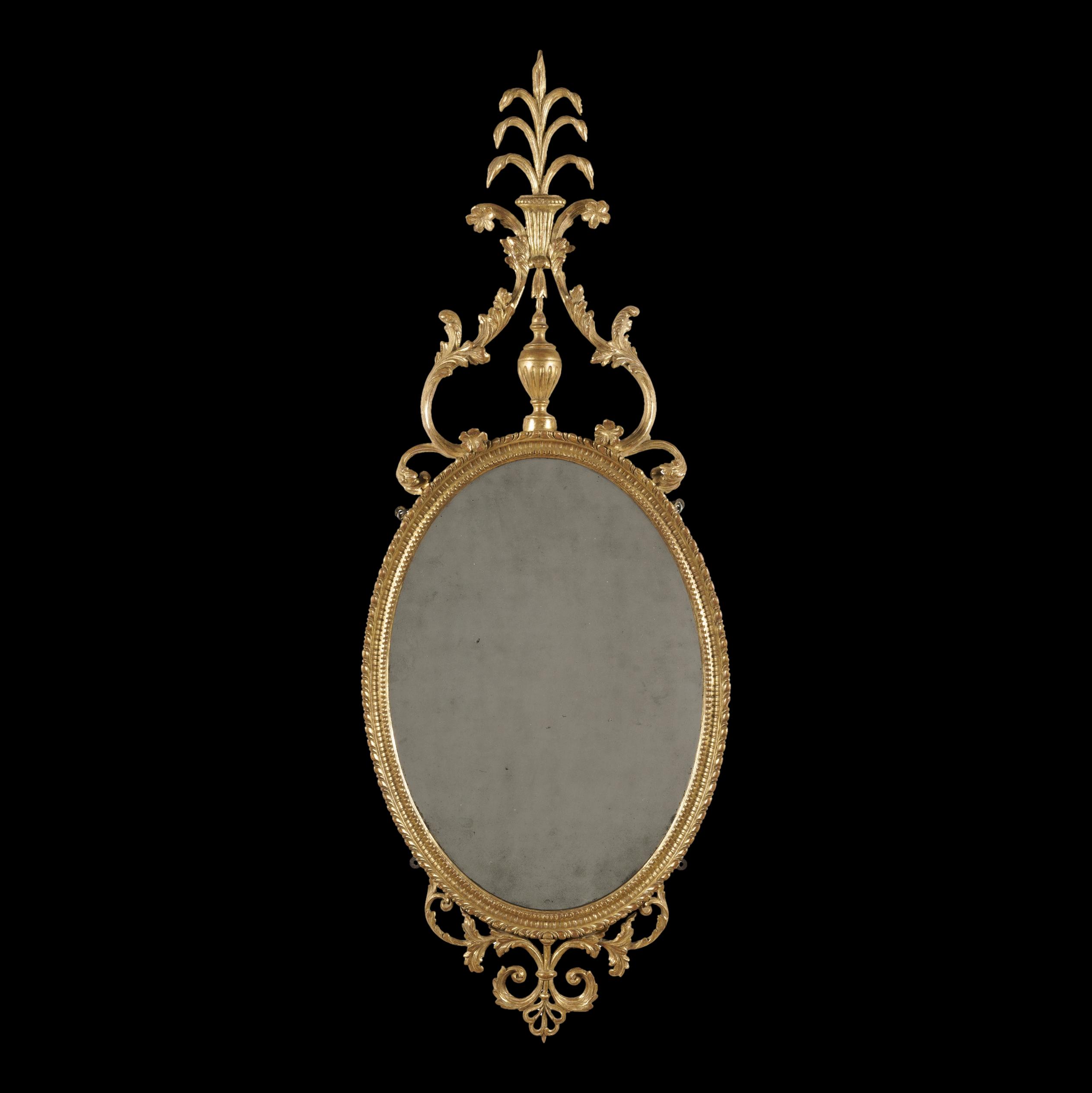Constructed from carved giltwood, housing an oval mirror plate within a stiff leaf moulding, with pendant scrolling acanthus leaves to the base, and further foliage to the top issuing anthemia above a central vase ornament.