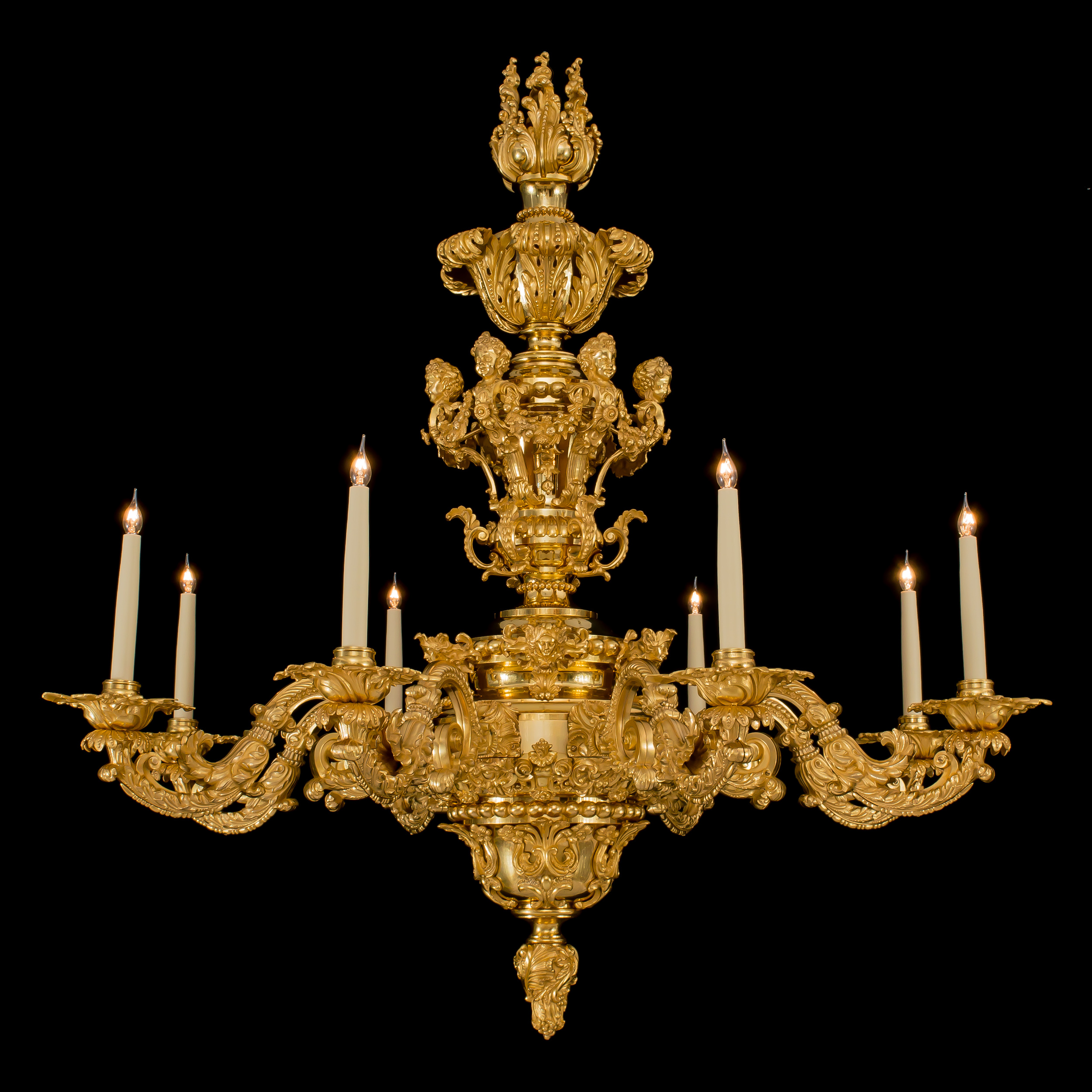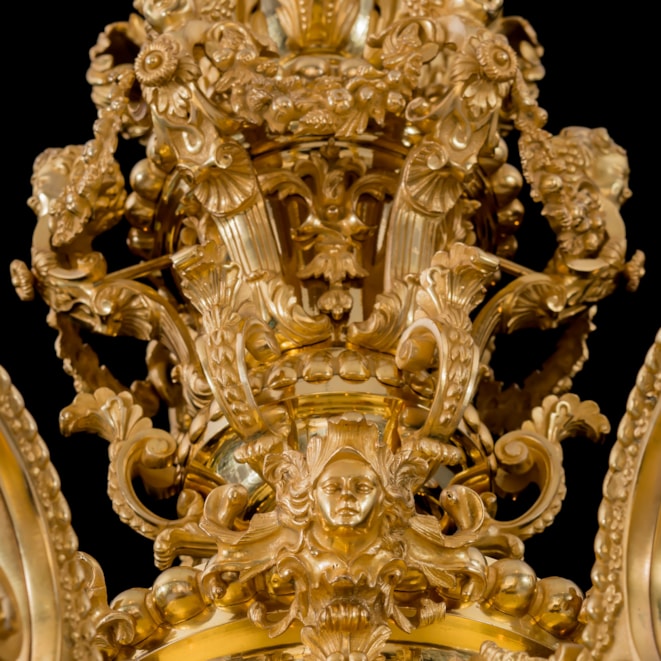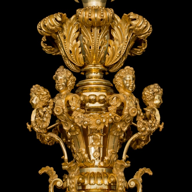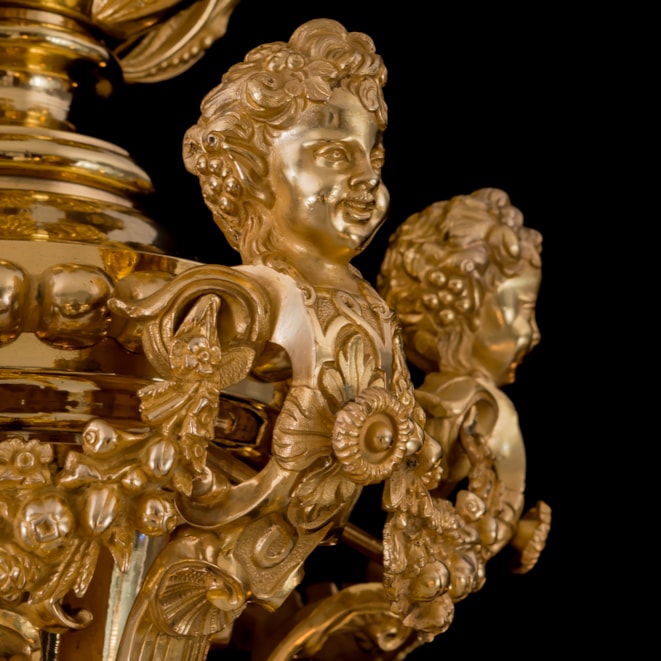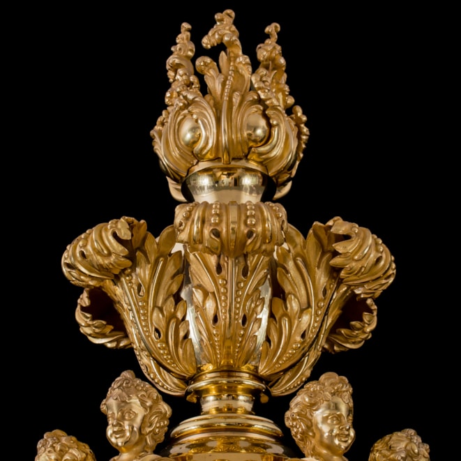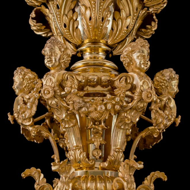 The 8-light chandelier of gilt bronze constructed around a central baluster and vasiform stem incorporating a bowl with tapering finial, the whole extensively decorated in foliate and acanthus leaf decoration; the 8 s-curved arms issuing from the stem beneath mascarons and terminating in stiff-leaf drip pans. The upper section in baluster form bearing addorsed putti herms in a cage-like configuration with draping floral garlands, beneath acanthus scrolls and a rocaille crest. Bearing the foundry marks "MESSENGER" and "M & P."