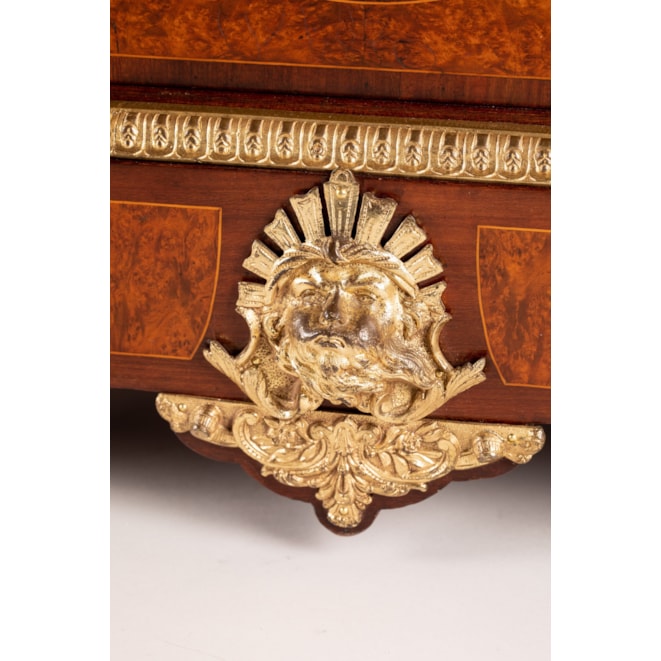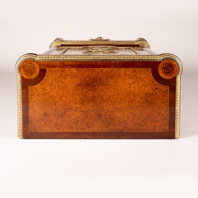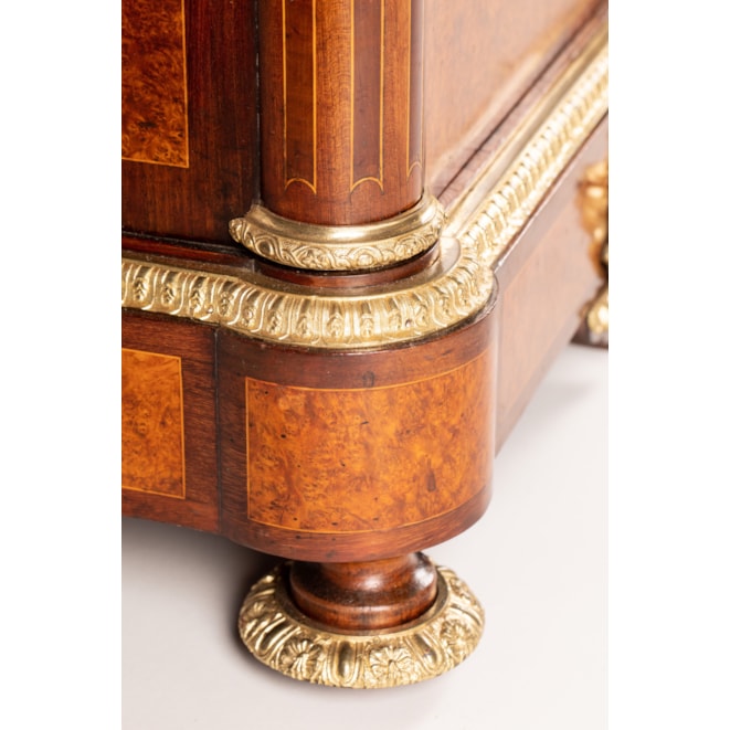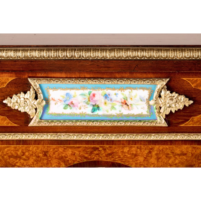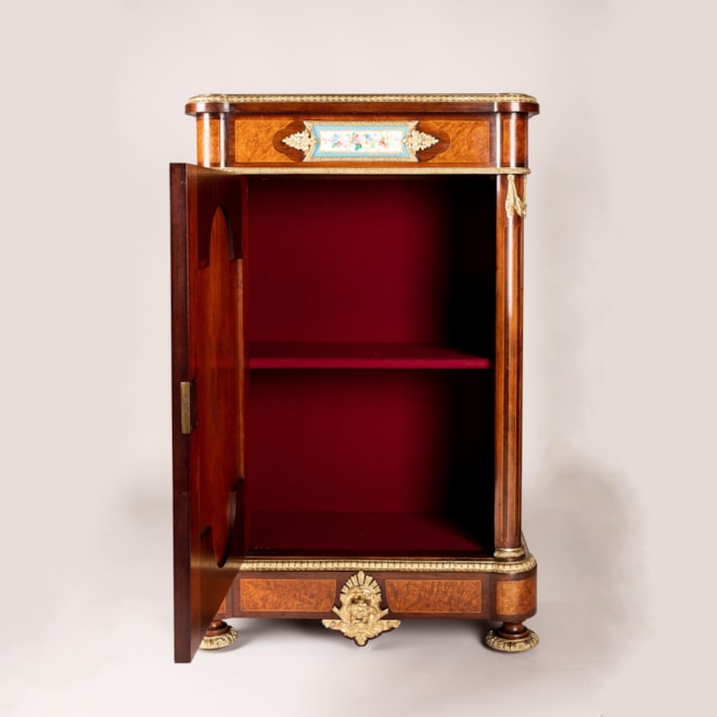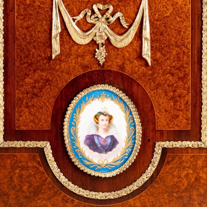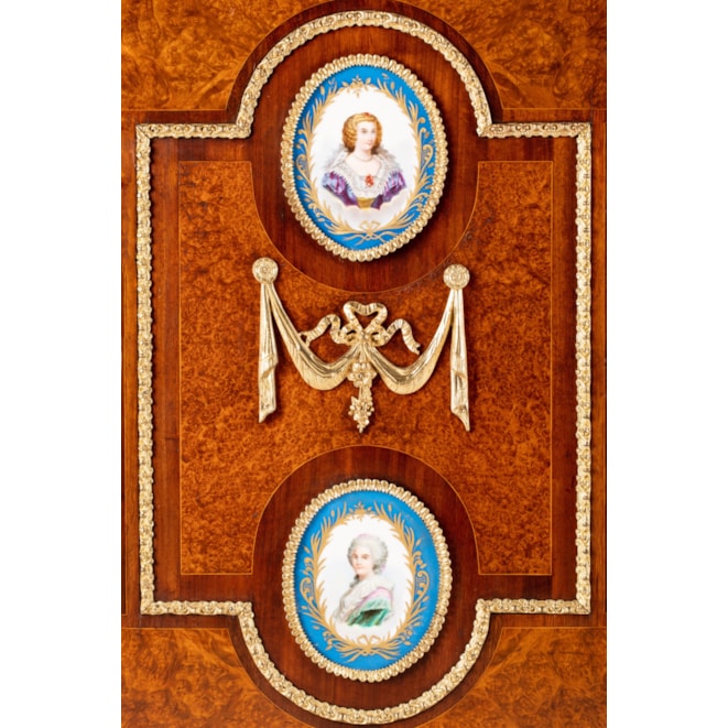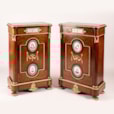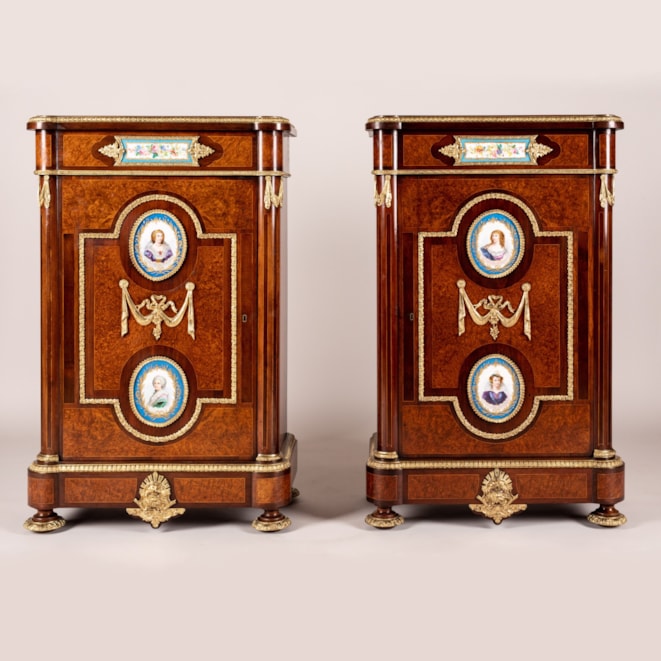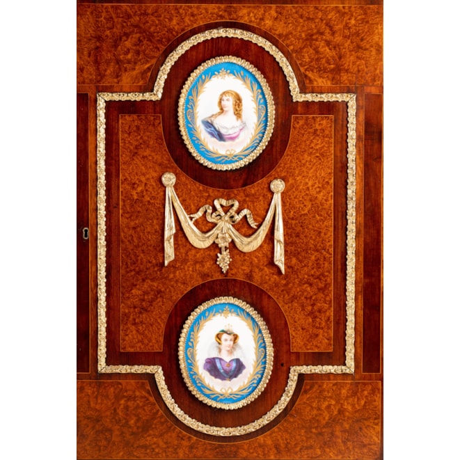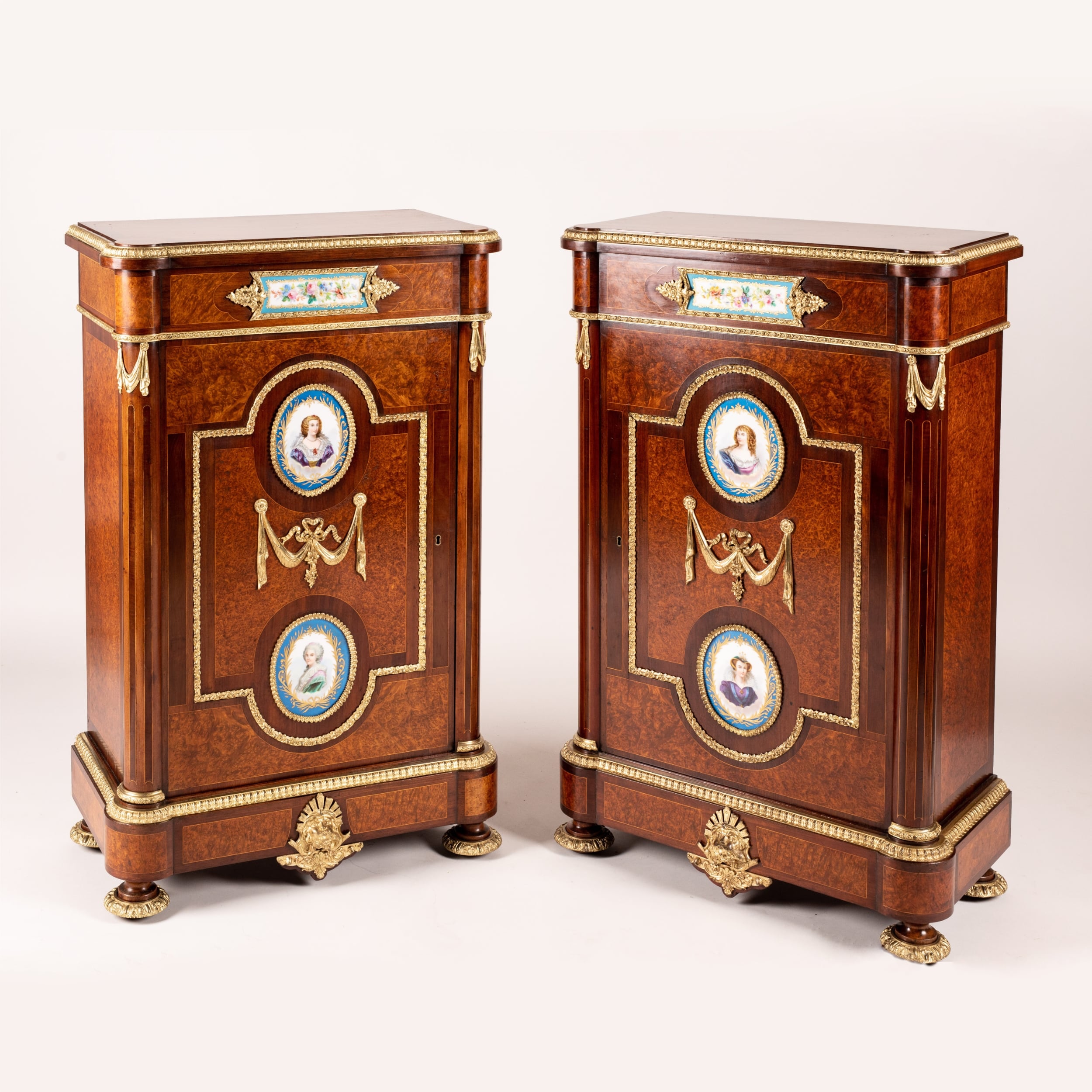 The English-made side cabinets with fixed-shelved interior constructed from rare amboyna with purpleheart crossbanding and boxwood stringing; each supported on ormolu-mounted oblate feet, the rounded corners with faux-fluted pilasters and bronze ribbons also featured on the central lockable doors set with two hand-painted oval porcelain plaques on bleu celeste ground showing female portrait busts; a further floral painted porcelain panel set within the frieze of each cabinet.
