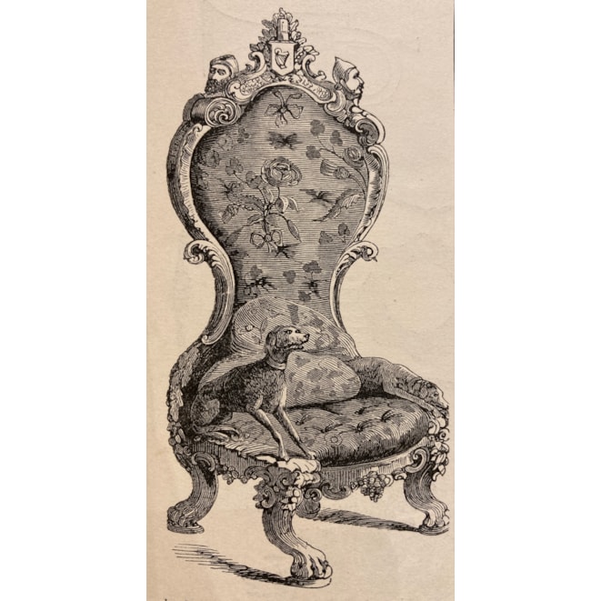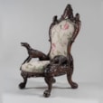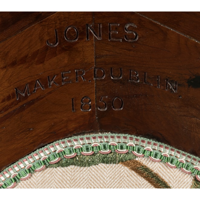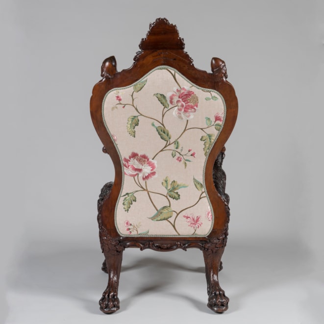 First displayed alongside a larger suite of furniture celebrating Irish history, the armchair was finished by Arthur Jones in 1850, just in time for its unveiling at the Crystal Palace Exhibition in London in 1851. The suite also included a card table, now in the permanent collection of the Victoria & Albert Museum, as well as a wine cooler part of the National Trust in Sydney Australia, and a pole screen in the Art Institute of Chicago.