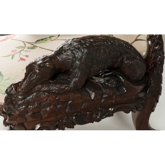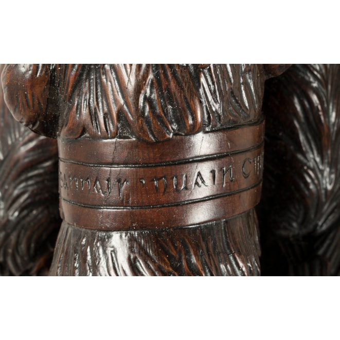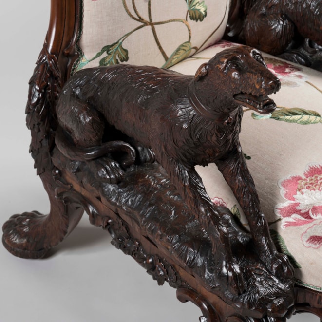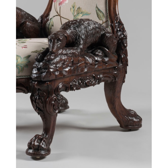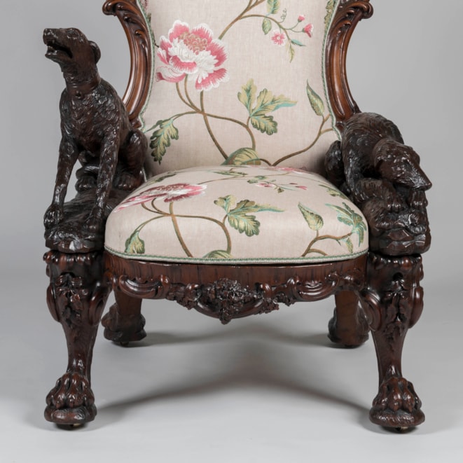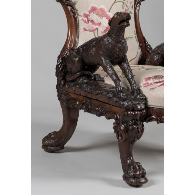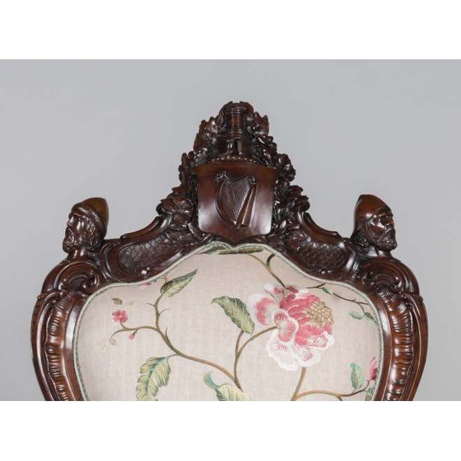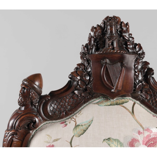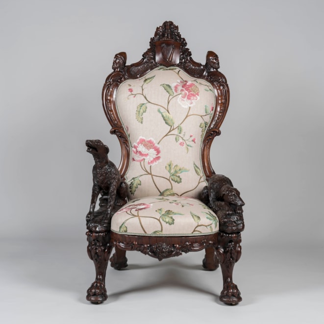Carved entirely from Irish bog yew wood, a timber celebrated for its rarity and its ability to achieve a beautiful polish due to its close grain; the armchair designed and manufactured by Arthur Jones "to illustrate the history, antiquities, animal and vegetable productions, etc., of Ireland." The carved back of the chair proudly displaying the ancient arms of Ireland in the form of a harp, surmounted by the rare crest and torse consisting of a tower with a deer leaping from the portal; flanked by carved oak leaves and two ancient Irish warrior busts; the waisted outline of the back leading toward the elbows of the fauteuil formed by two carved wolf dogs; one recumbent with its collar inscribed "Gentle when stroked" in Gaelic, while its counterpart standing at attention, his collar reading "Fierce when provoked." Supported on four lion-paw feet with hidden castors, carved with oak leaves and acorns, complementing the carved shamrock decorated apron. With later upholstery. The back signed by the maker 'Jones / Maker. Dublin. / 1850.'